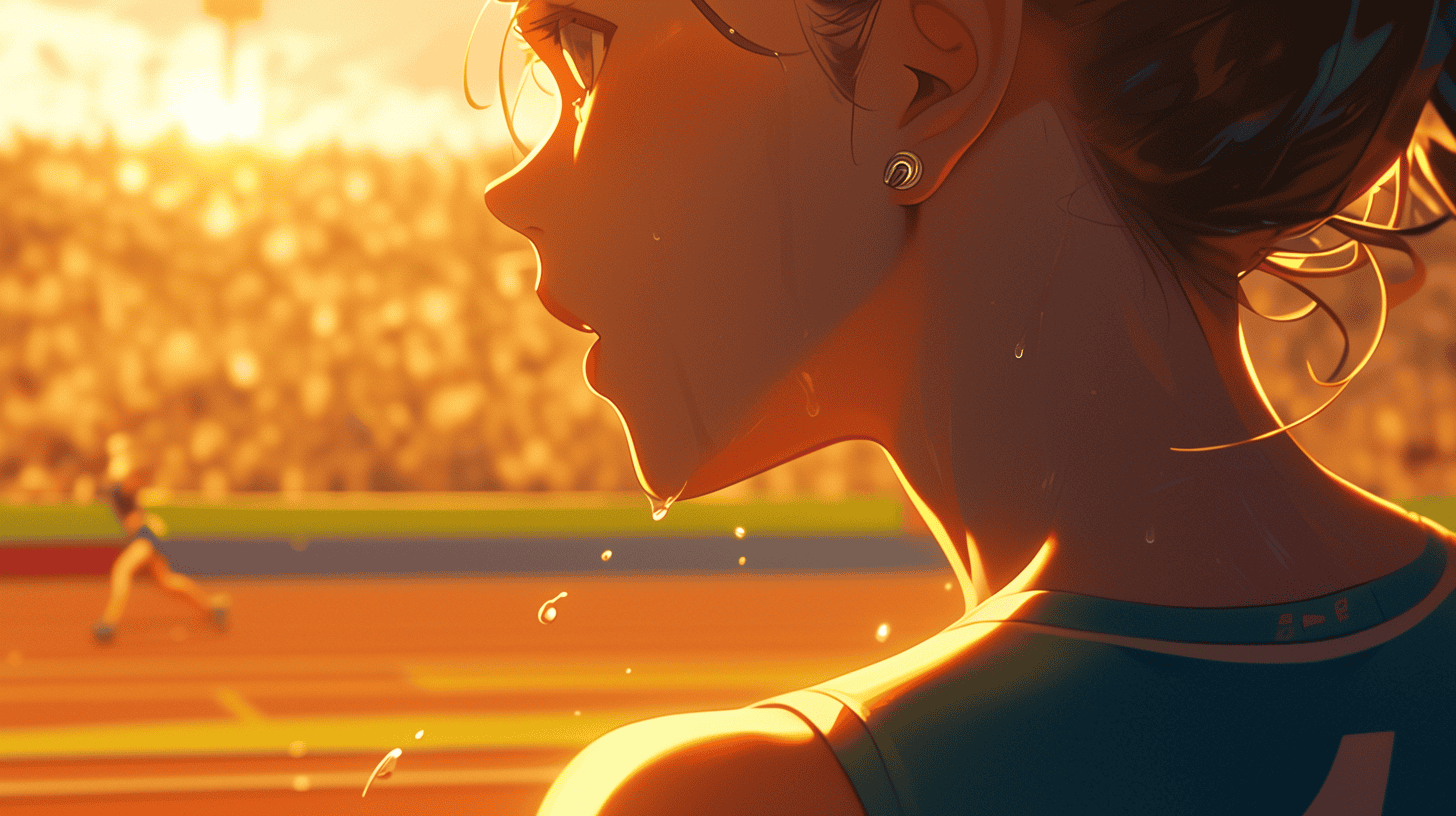 Prompt: a woman at the finish line, track and field, closeup, sunset -