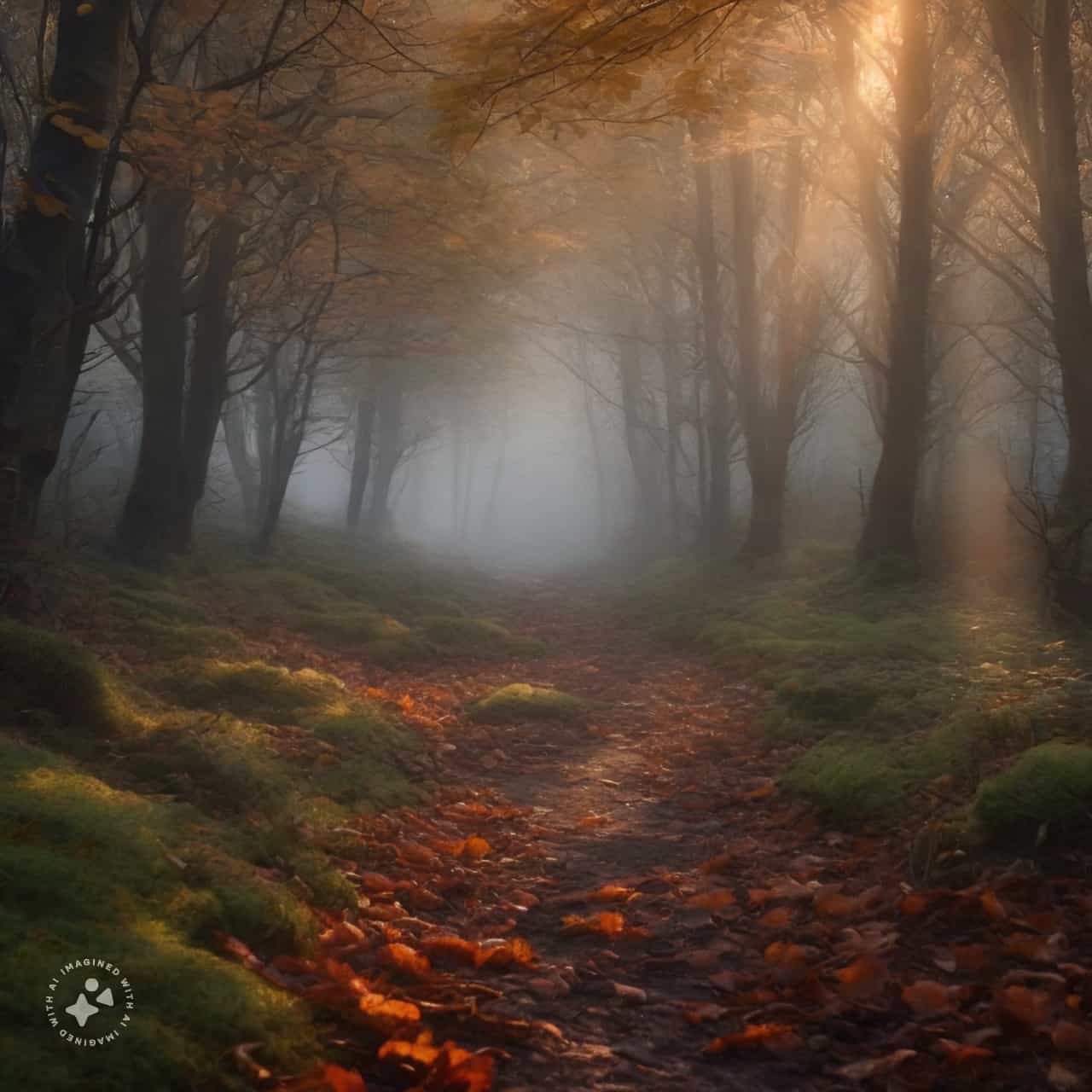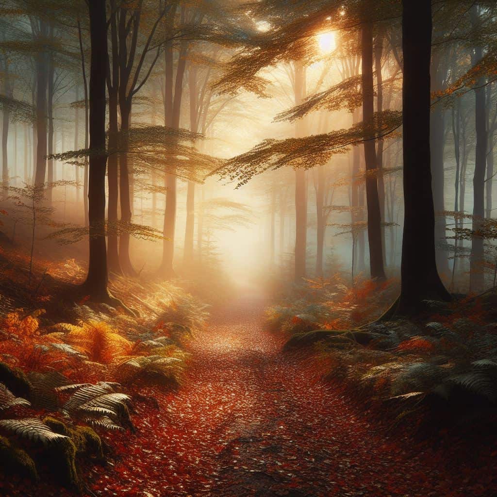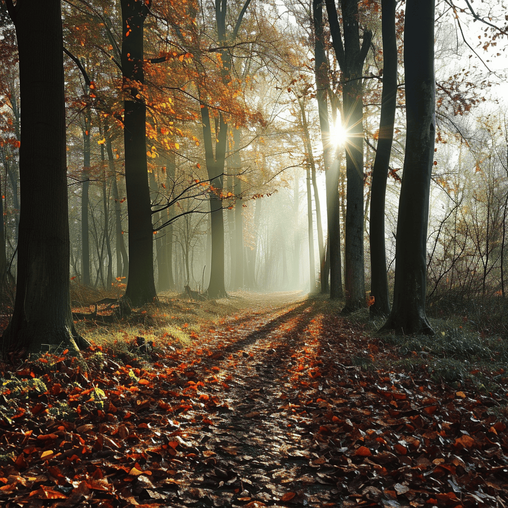 Prompt B: misty autumn forest path, fallen leaves carpeting the ground, sunlight filtering through the trees at daybreak