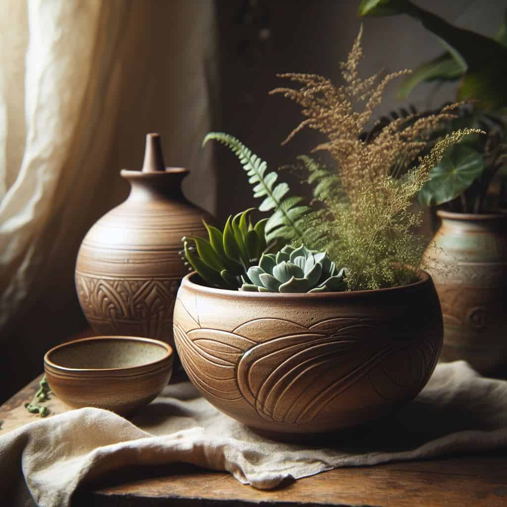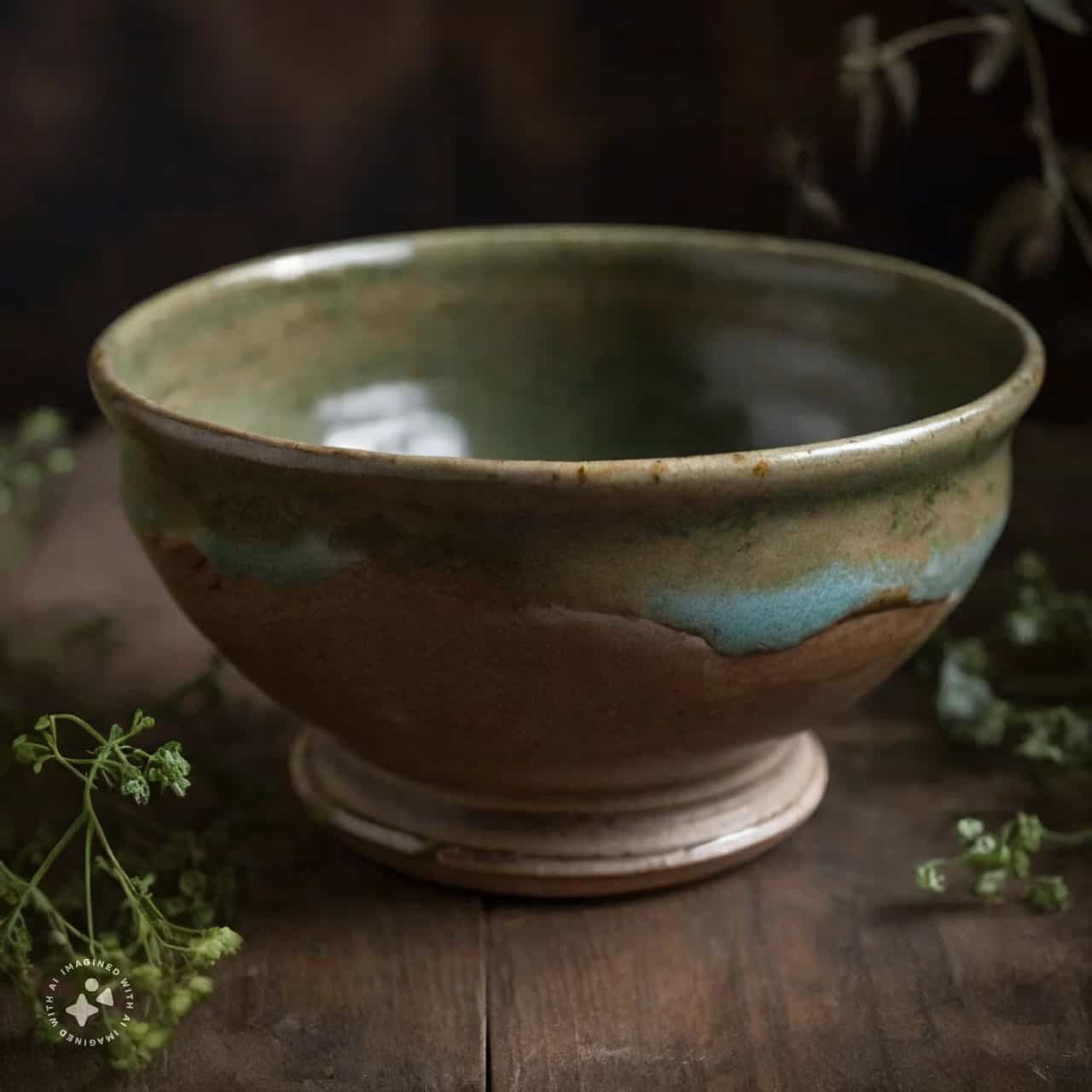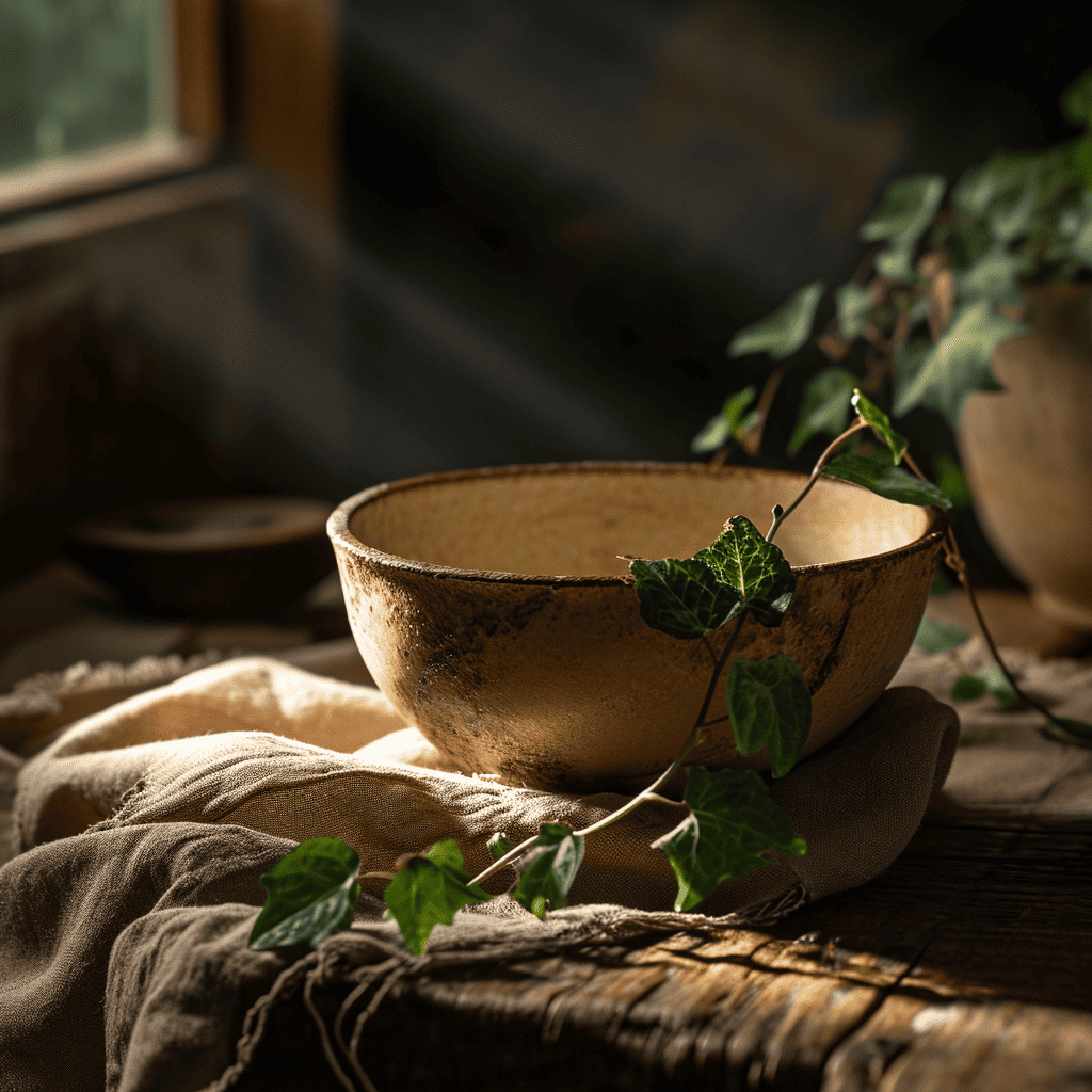 Prompt B: commercial photography, a handcrafted ceramic bowl, earth tones, soft lighting, plants