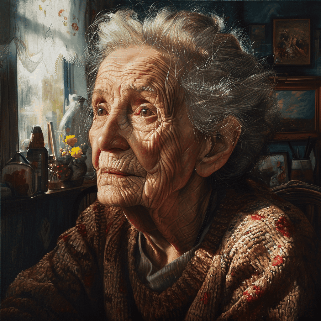 Prompt B: a hyper-realistic portrait of an elderly woman, her face etched with the lines of time and experience, but her eyes shining with wisdom and warmth. she sits in a sunlit room, surrounded by mementos of a life well-lived. the portrait captures both the beauty of age and the enduring strength of the human spirit. wide-angle. inspired by rembrandt.