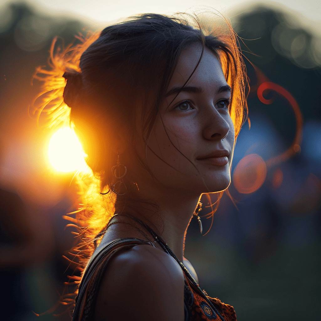 Prompt A: a young woman attending a music festival, backlighting, portrait