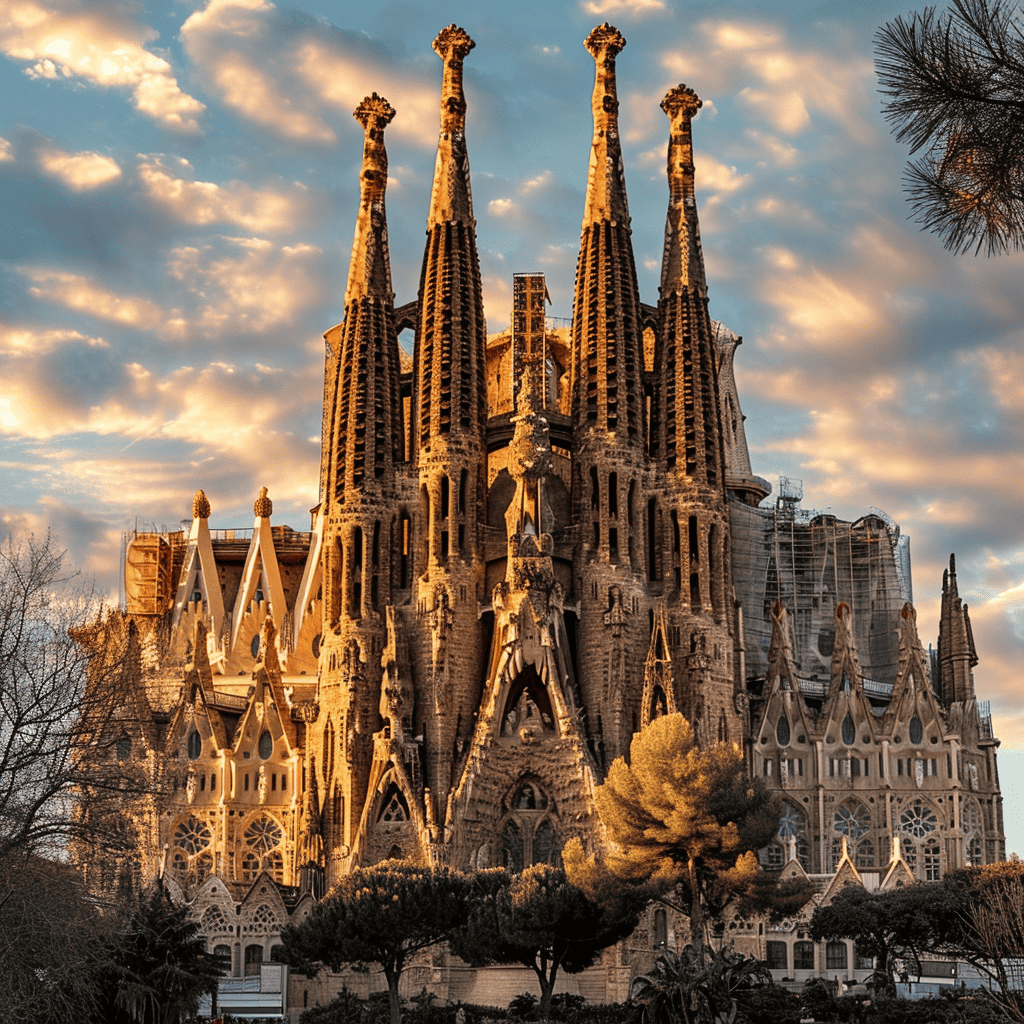 Prompt B: exterior, a cathedral by Antoni Gaudí during sunset, architecture