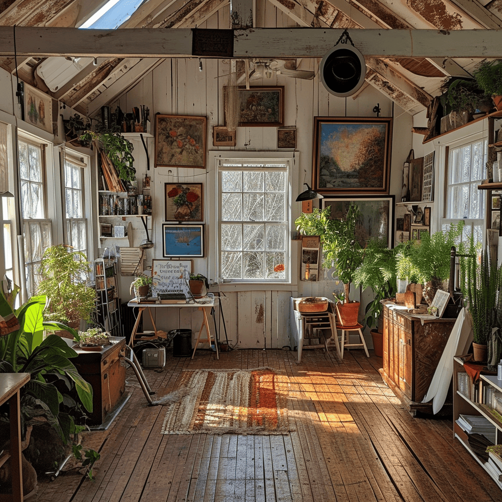 Prompt A: interior, a shed purposed as an art studio, bohemian, cottagecore, natural light, whimsy, biophilic
