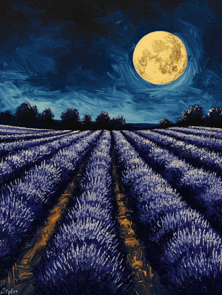 Prompt B: rows upon rows of lavender stretch to the horizon under a full moon, in the style of vincent van gogh