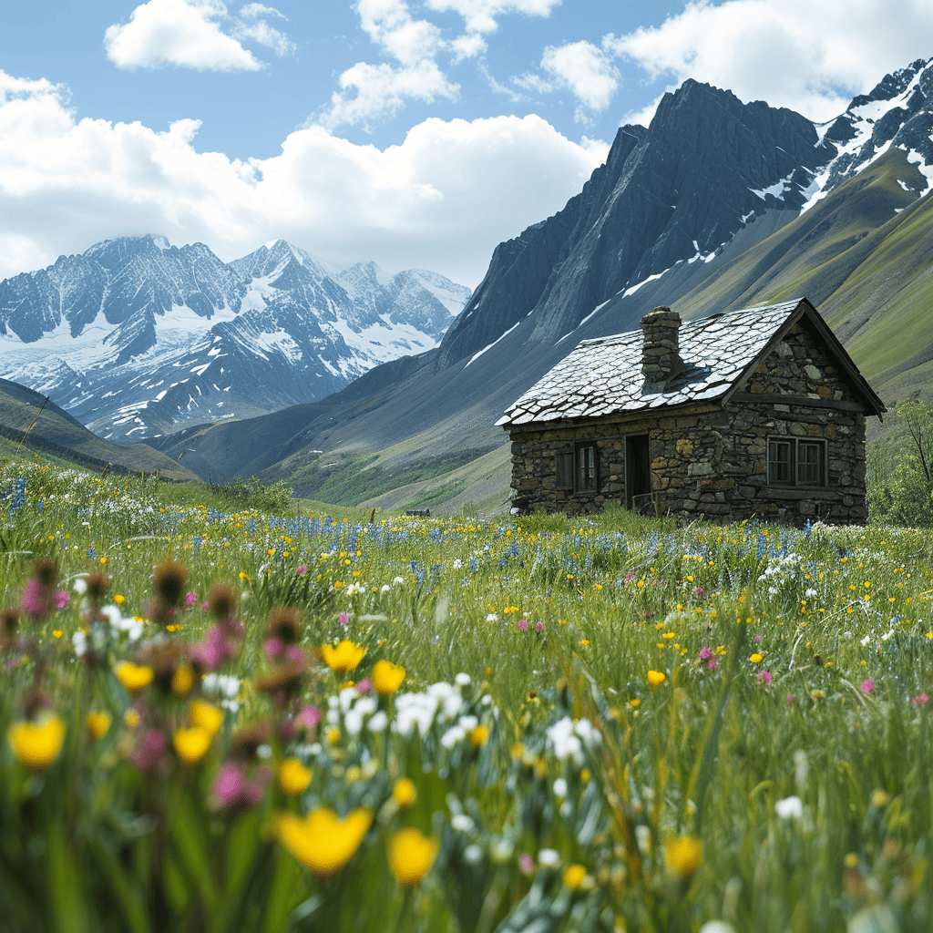 Prompt A: solitary stone cabin in a vast alpine meadow, wildflowers in bloom, snow-capped peaks in the distance