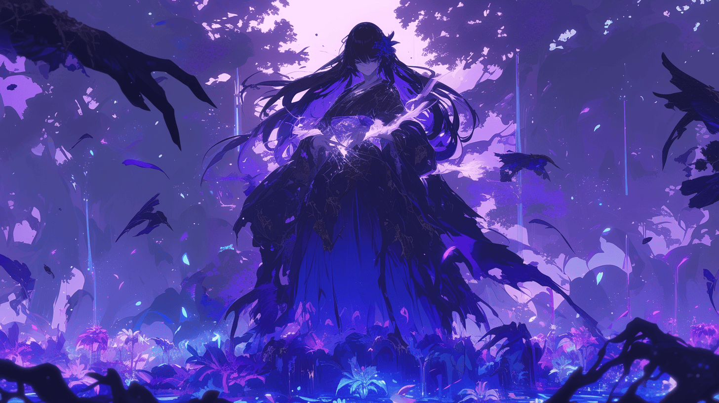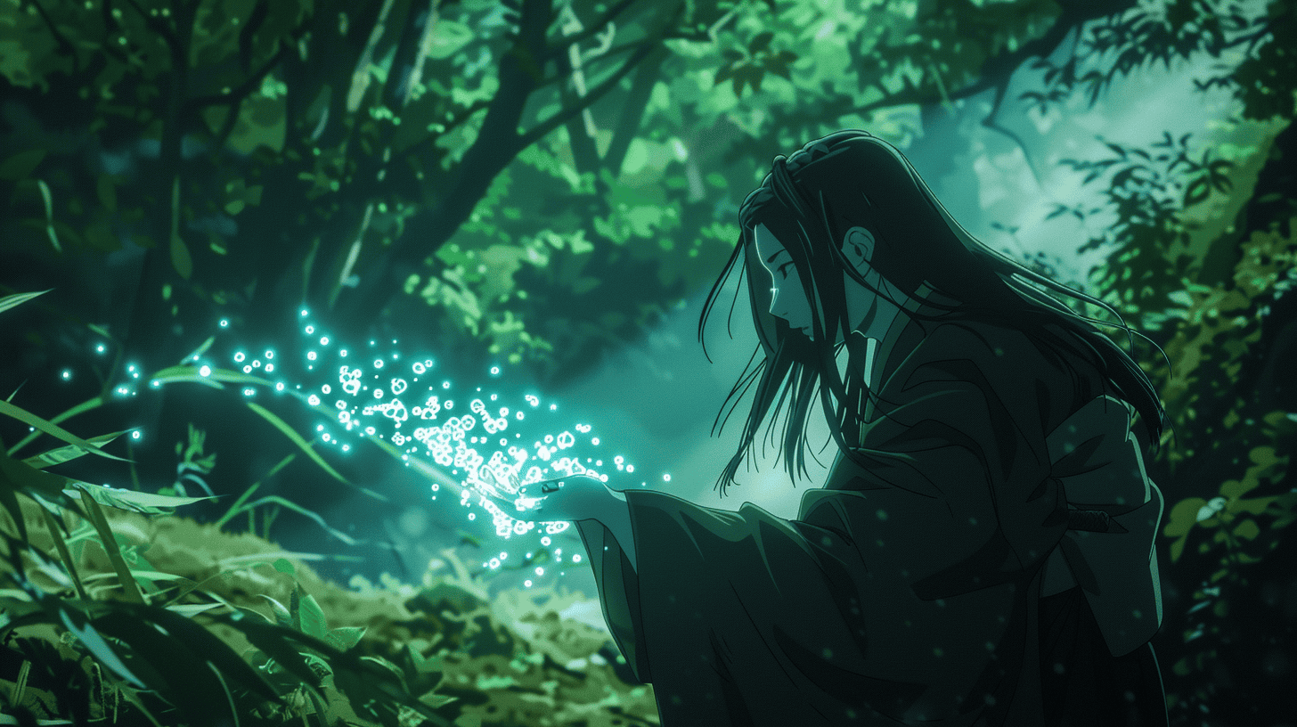 Prompt: fantasy anime still, a powerful woman sorceror casts a spell on a dark forest to control the plants, grand scale, dark fantasy, runes, heian period, wide shot