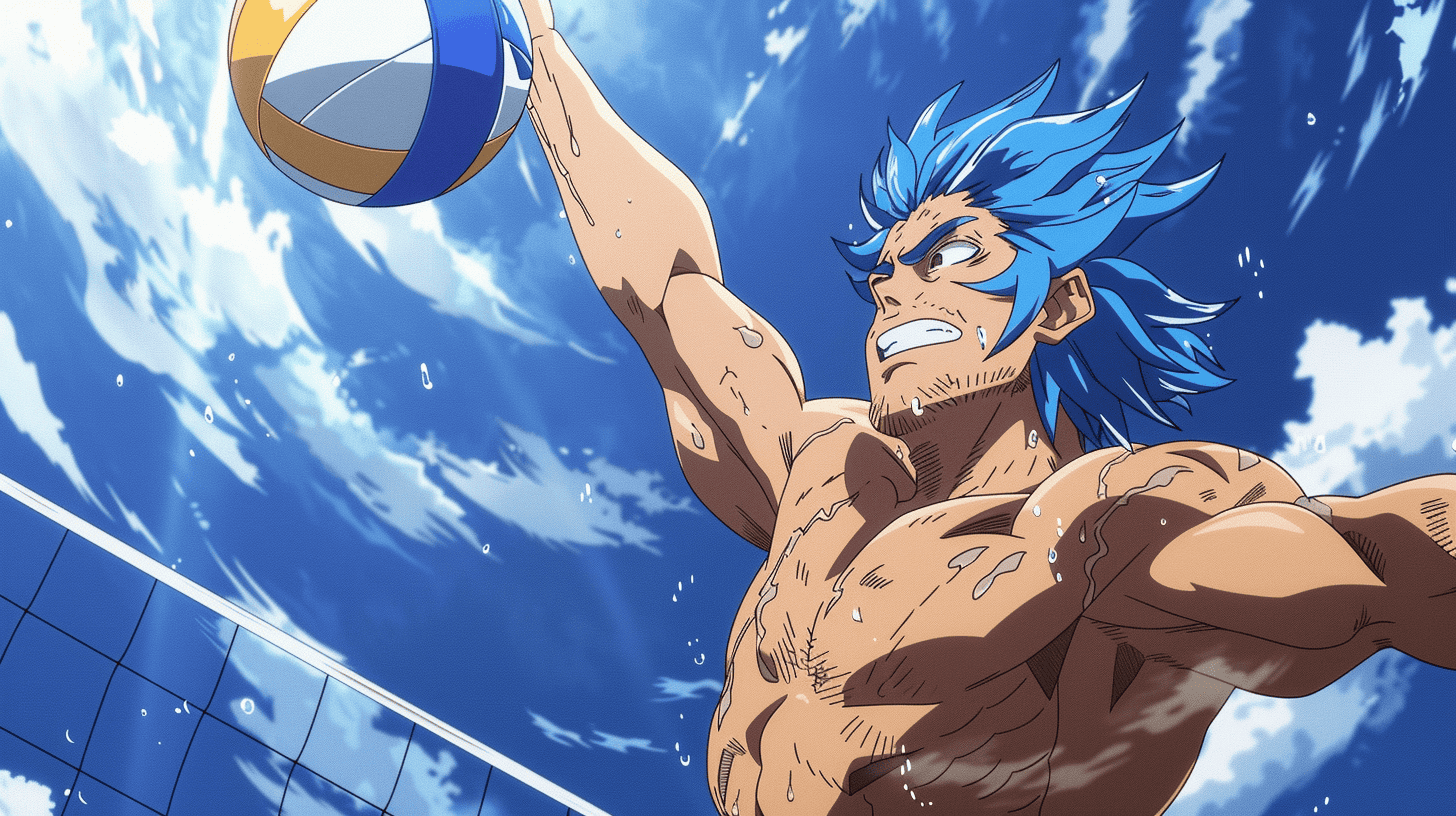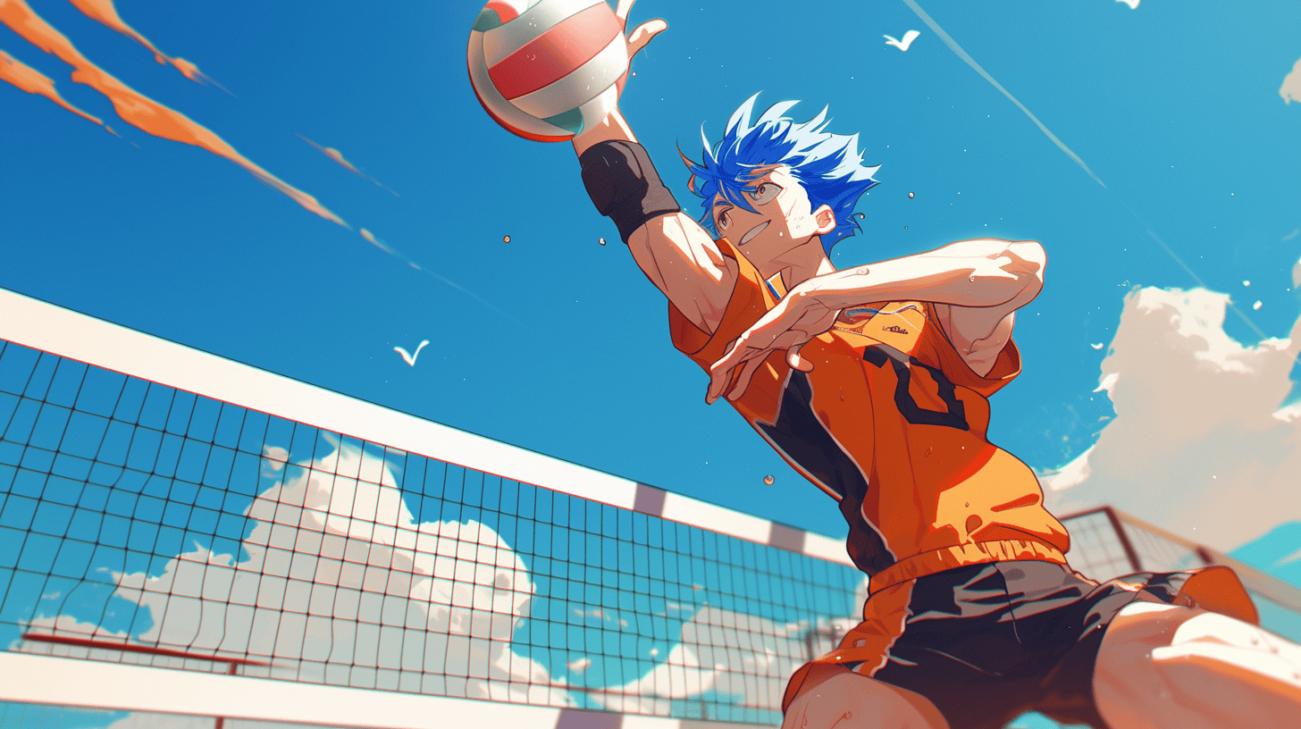Prompt: sports anime, a blue haired man spiking a volleyball