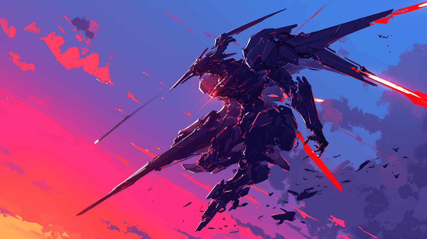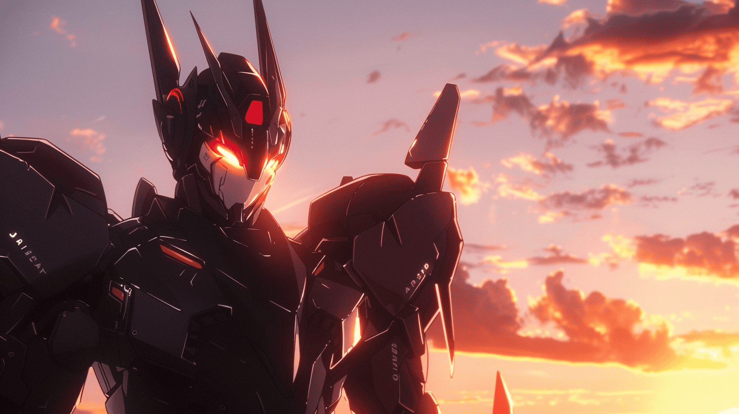 Prompt: mecha anime, a sleek black mecha with glowing red eyes flying in the sky, sunrise