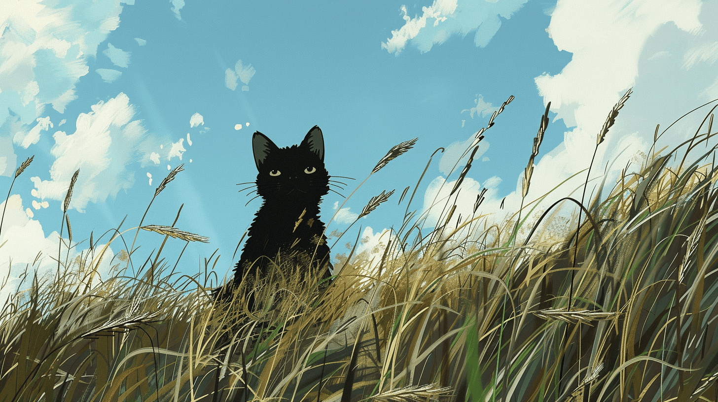 Prompt: a black cat in the middle of the field, studio ghibli, hayao miyazaki, semi-minimalist