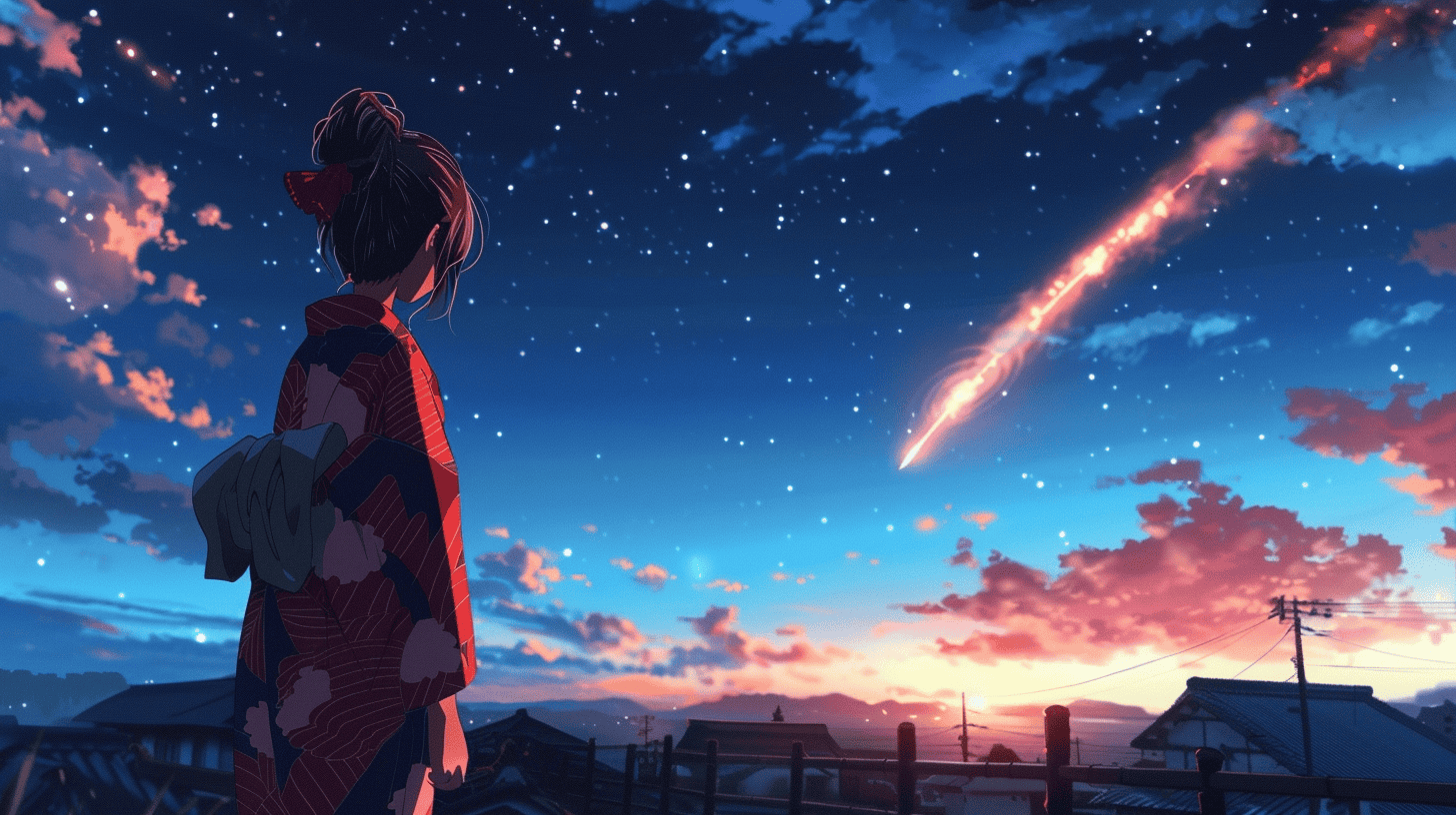 Prompt: a woman in a kimono watching a comet approach her, makoto shinkai