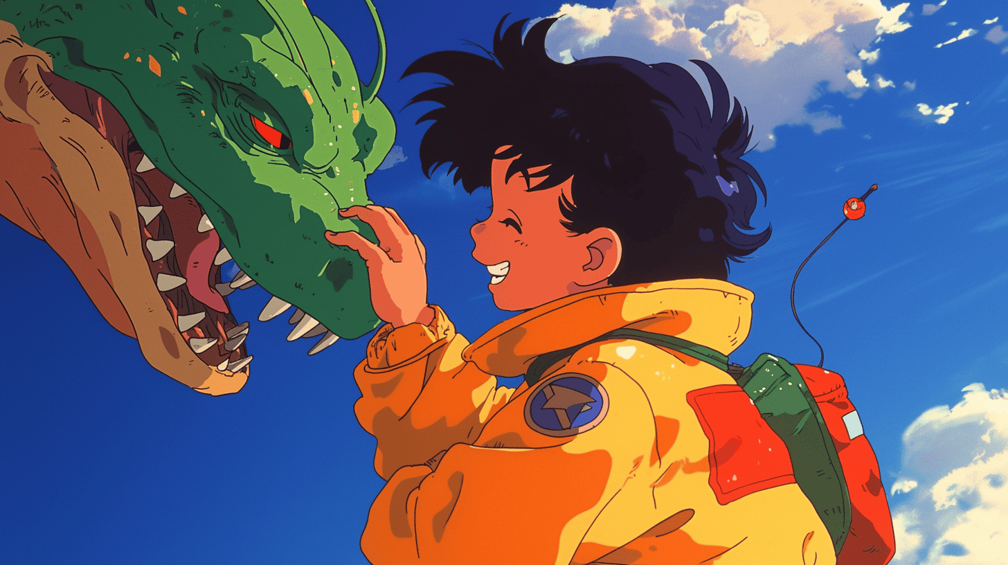Prompt: a child playing with an alien, drawn by Akira Toriyama, animated by Toei animation studio, 1985 Japanese anime