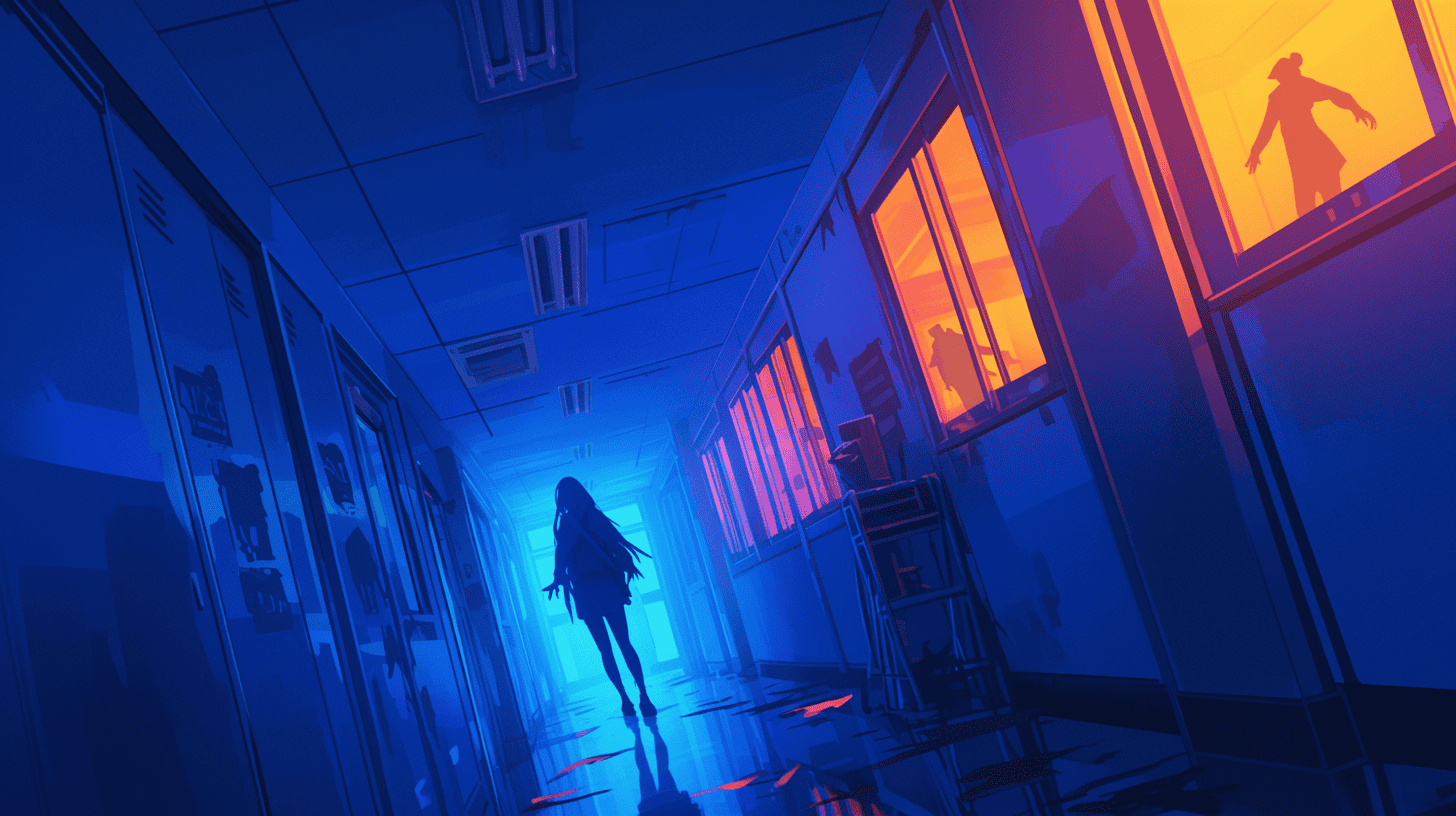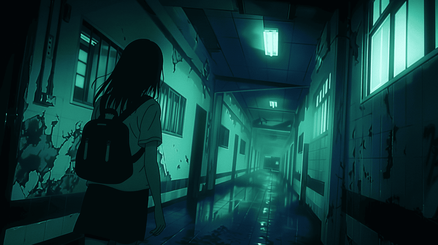 Prompt: horror anime, a teacher walking down a dimly lit high school hallway at night, strange figures, obscured, inspired by Satoshi Kon