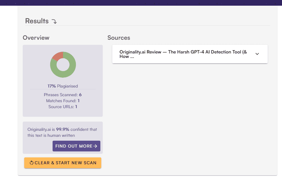 Regardless of the type of writing you test with Originality, you'll see a percentage determining the odds that text was written with AI (other detectors like Sapling and Winston call this “AI likelihood score” or something similar). The tool will also provide the link to pages it finds plagiarism violations on.