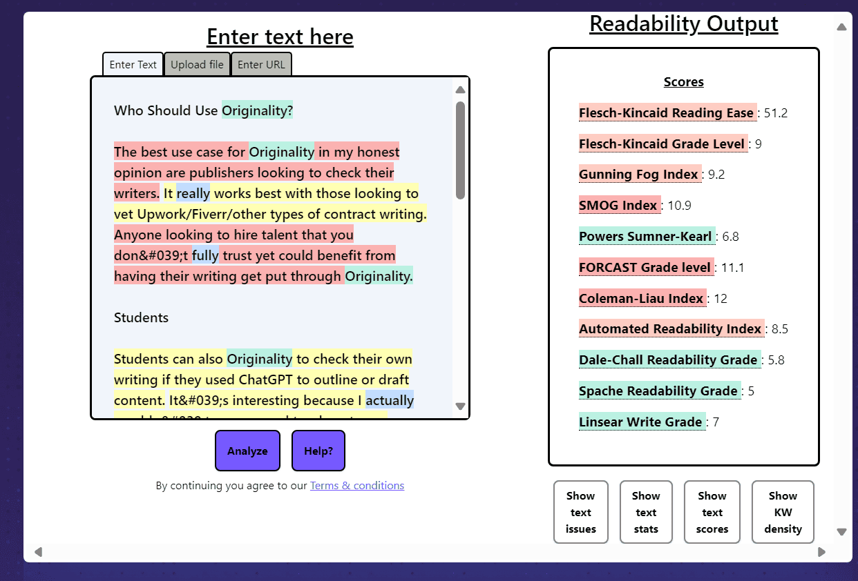 Originality also has a readability checker which aims to give you more information about your content score, stats, reading level, etc. This tool is completely free and is great for testing the level of writing you or your contractors have been producing.