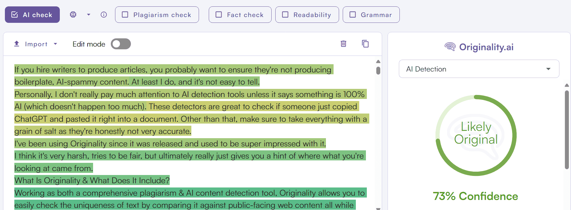 If you frequently edit content that you don't necessarily write, Originality could lift some stressful weight off your back. Being able to quickly run a quality assurance check across the content you work with could potentially save you hours validating content. This works well for plagiarism checking on top of AI writing.