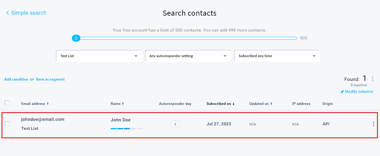 Open your GetResponse dashboard. Click ‘Contacts.’. At the bottom of the page, you should see the list of users that submitted a form. That's it!