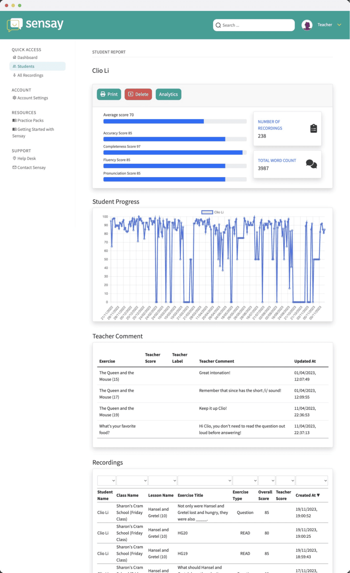 You can also easily track your students’ progress to identify pain points for each of them. This gives you an overview of your students’ growth and equips you with an analytics section which includes a breakdown of their learning in English words, syllables, and phonemes. You can even leave a comment on a specific task which the learner can view any time.