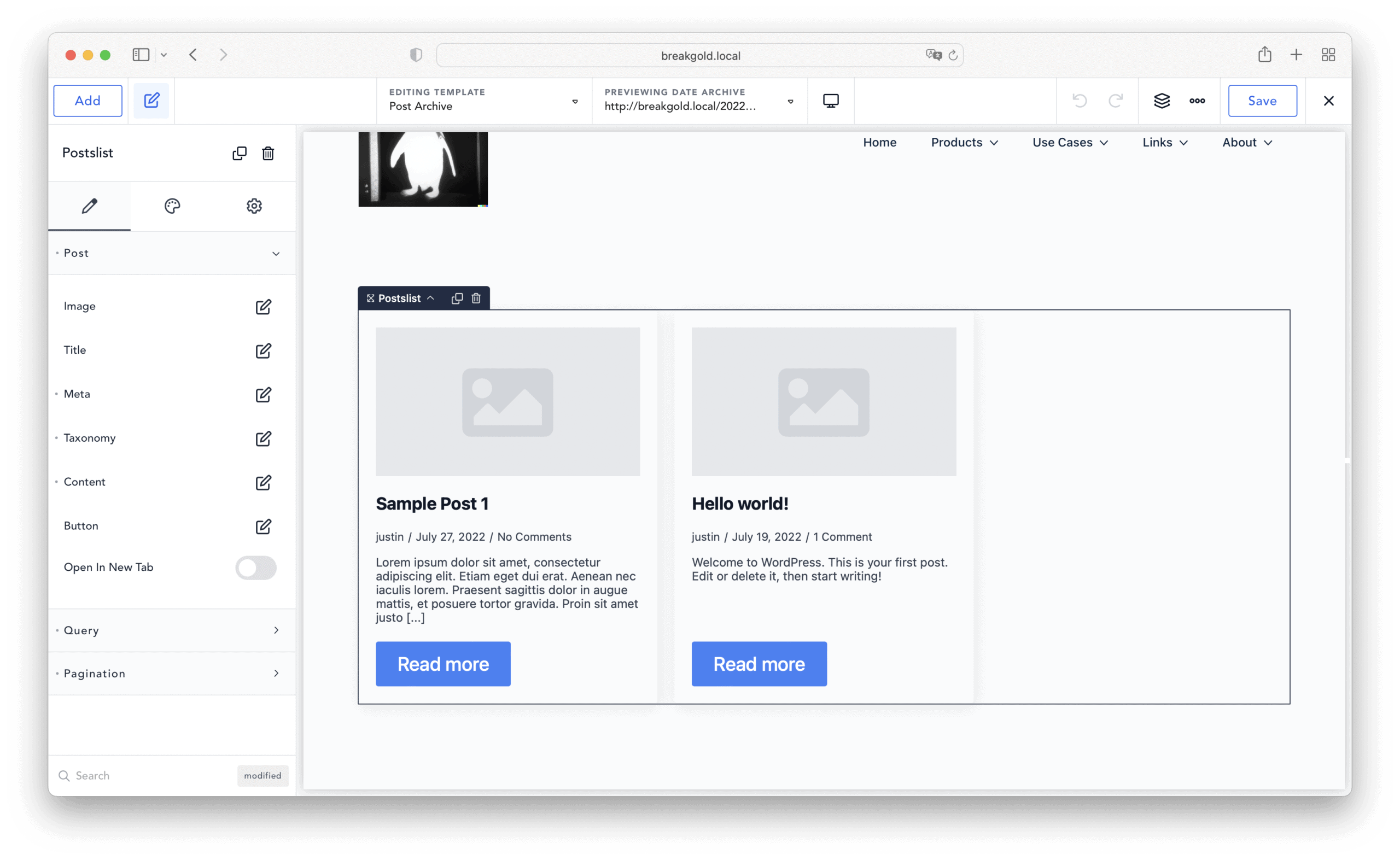 If you don't like the default organization of the page, open the Breakdance -> Post Archive Template. Here you'll see the Postslist block which you can customize to your choosing. You can edit visual or design options like Image, Title, Meta, Taxonomy, Content, Button, Query, and Pagination Settings.