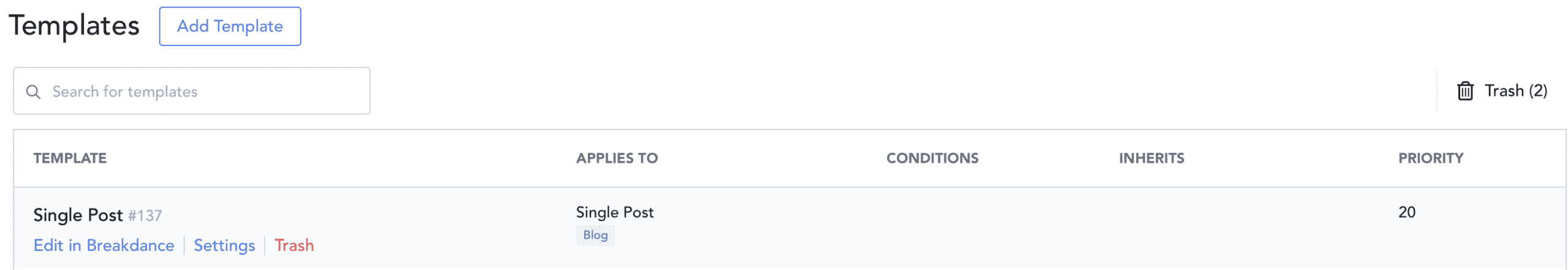 To customize your individual post template, go into Breakdance -> Templates. Add a 'Single Post' template and assign it a priority (in this case we used 20). Open the template to edit it. Here you can add a section then insert dynamic elements to the page to customize what content you want showing.