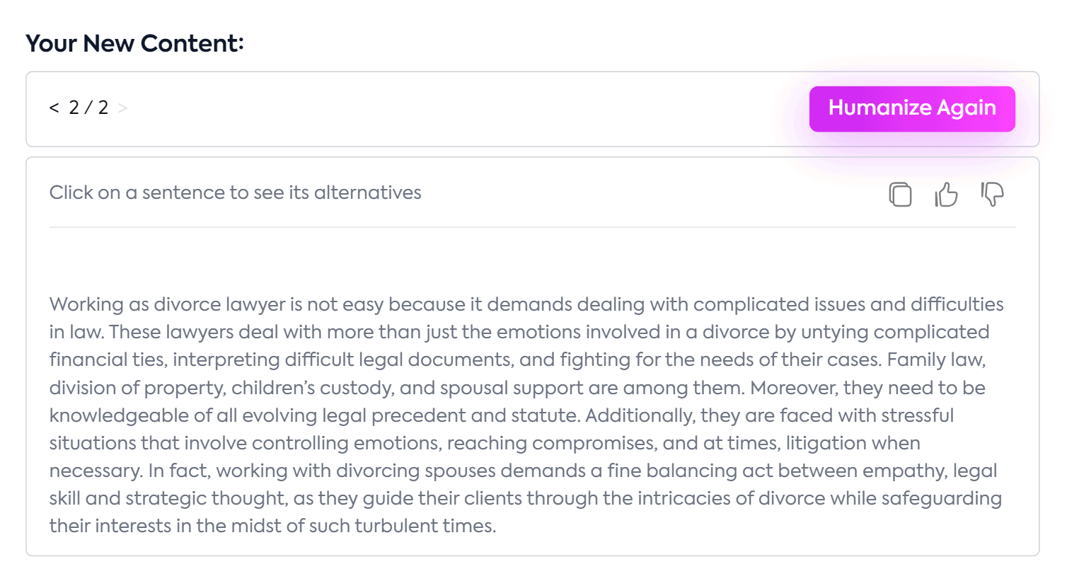 Stealth Writer is the first AI undetectable tool I’ve seen to offer content options, which means each text you rewrite has two outputs from which you can choose.