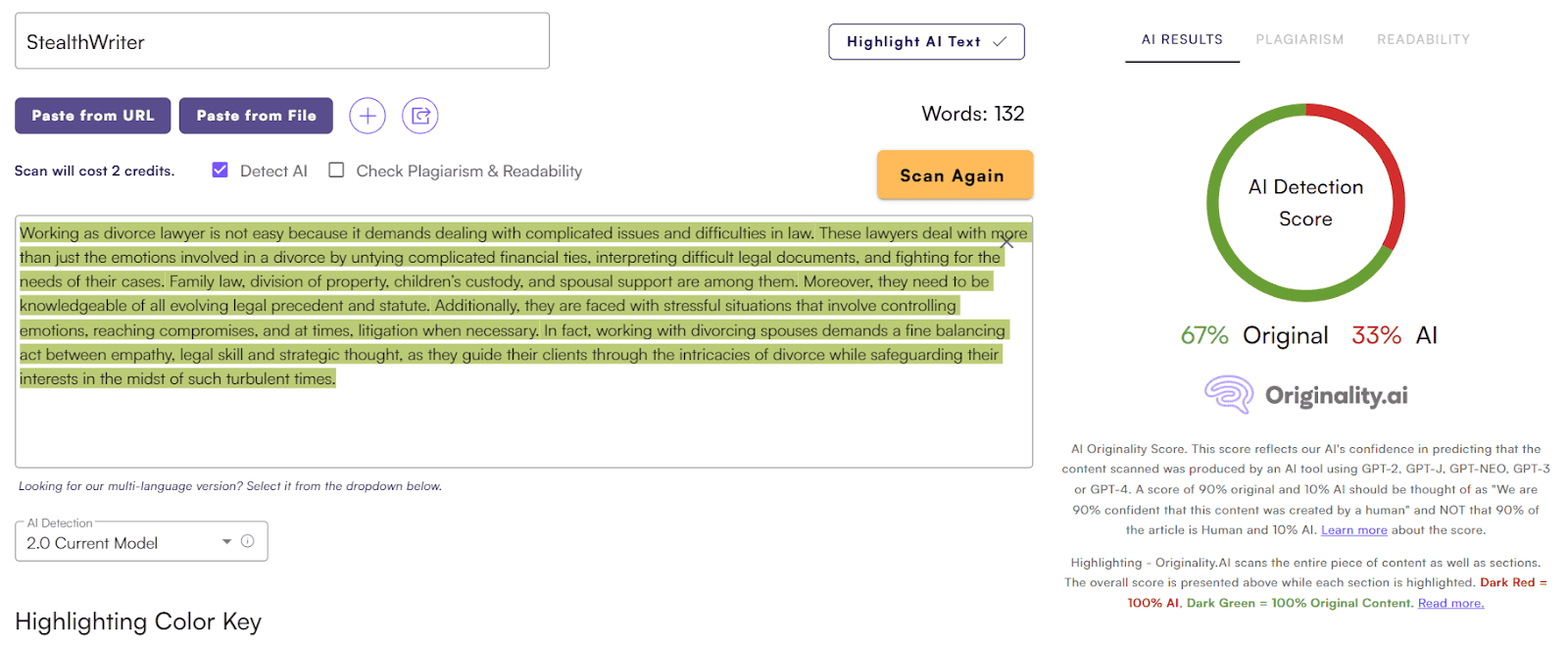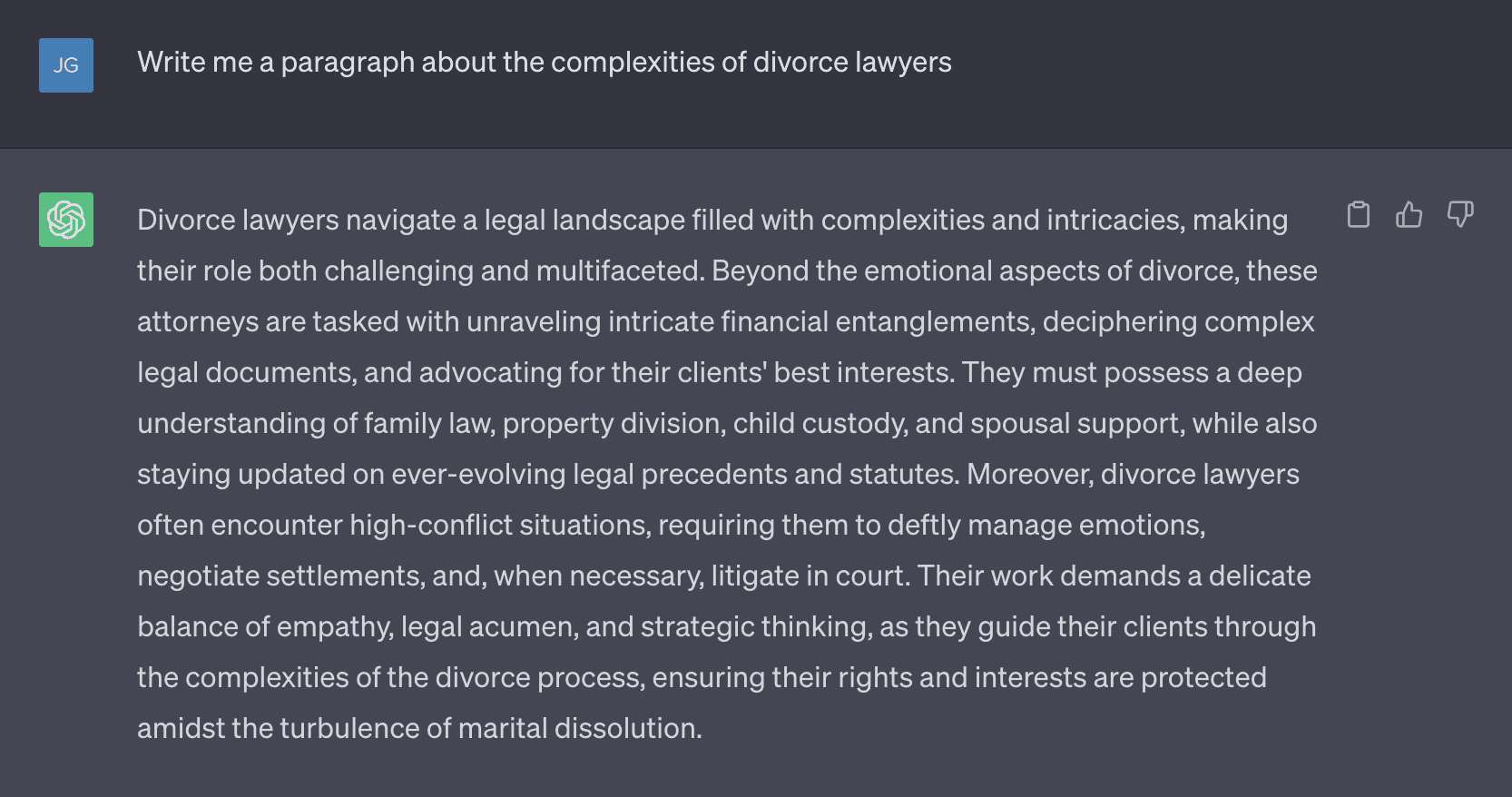 I've gone ahead and asked ChatGPT for a paragraph on divorce attorneys. Let's see what it gives & let's see how it performs when put in Originality's AI detection tool.