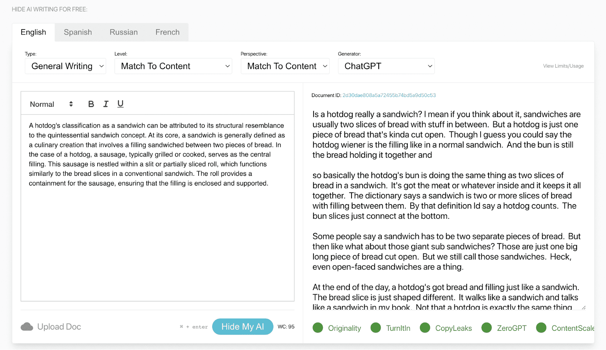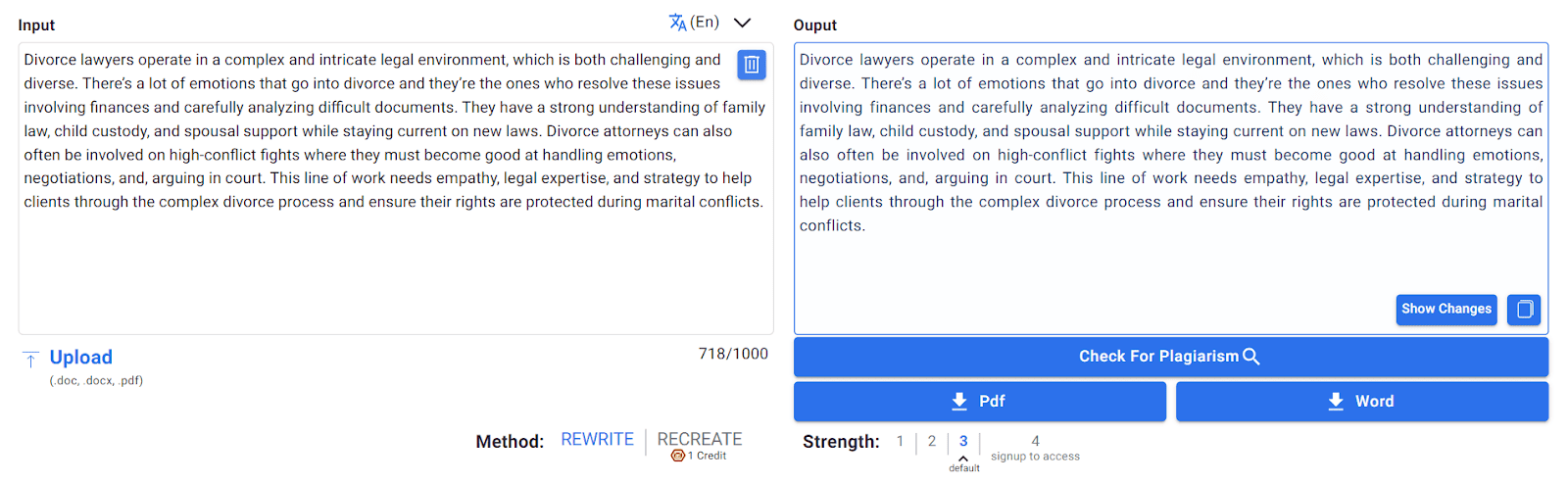 It also works the same way as Undetectable. You just paste your writing, change the options, and let it do the rest. Compared to Undetectable, you'll get a bit more words to transform for free, which could be better depending on who you are and what you’re using it for.
