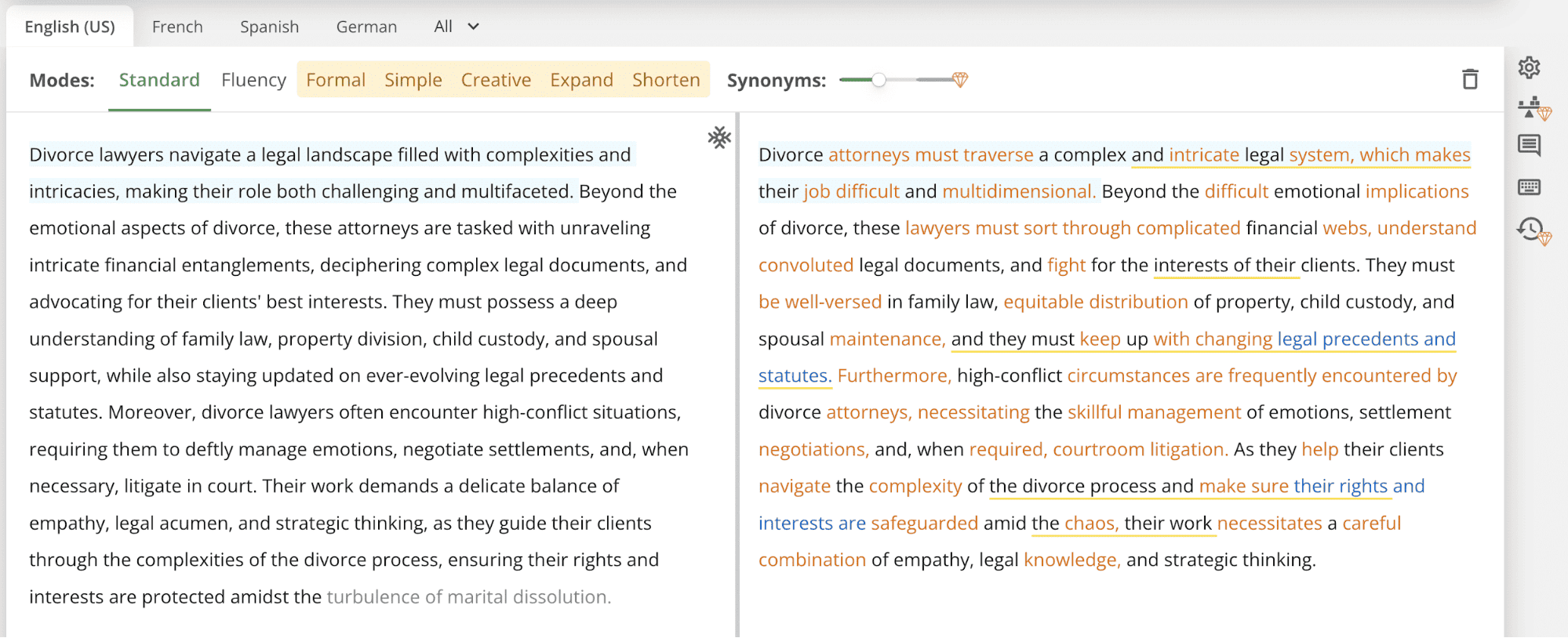 Once you paste a block of text you'll see words get highlighted in orange and blue. If you click on any of these words, you'll have the option to change them to another synonym.