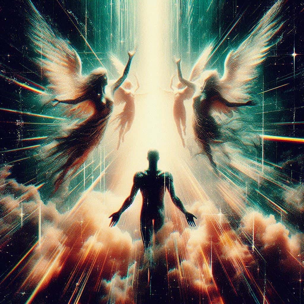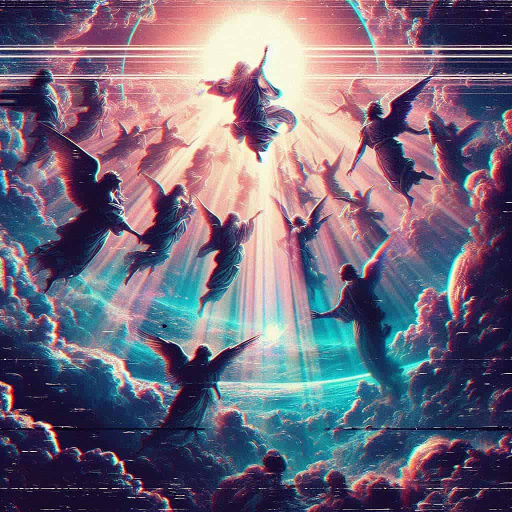 chromatic aberration, vhs effect, scratches, heavenly figures dissipate into nothingness