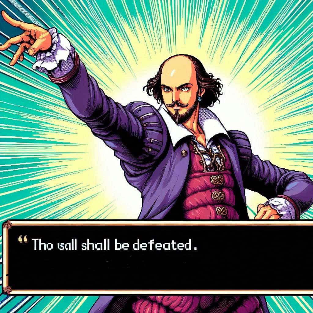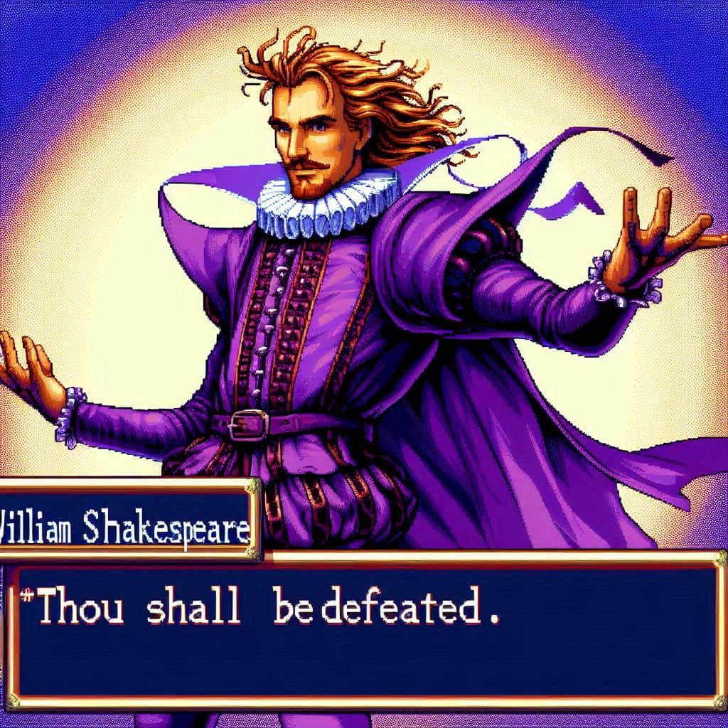 style of a 90s JPRG, William Shakespeare strikes a dramatic pose, a text box has the character's name and reads "thou shall be defeated", dynamic lighting, 90s JRPG