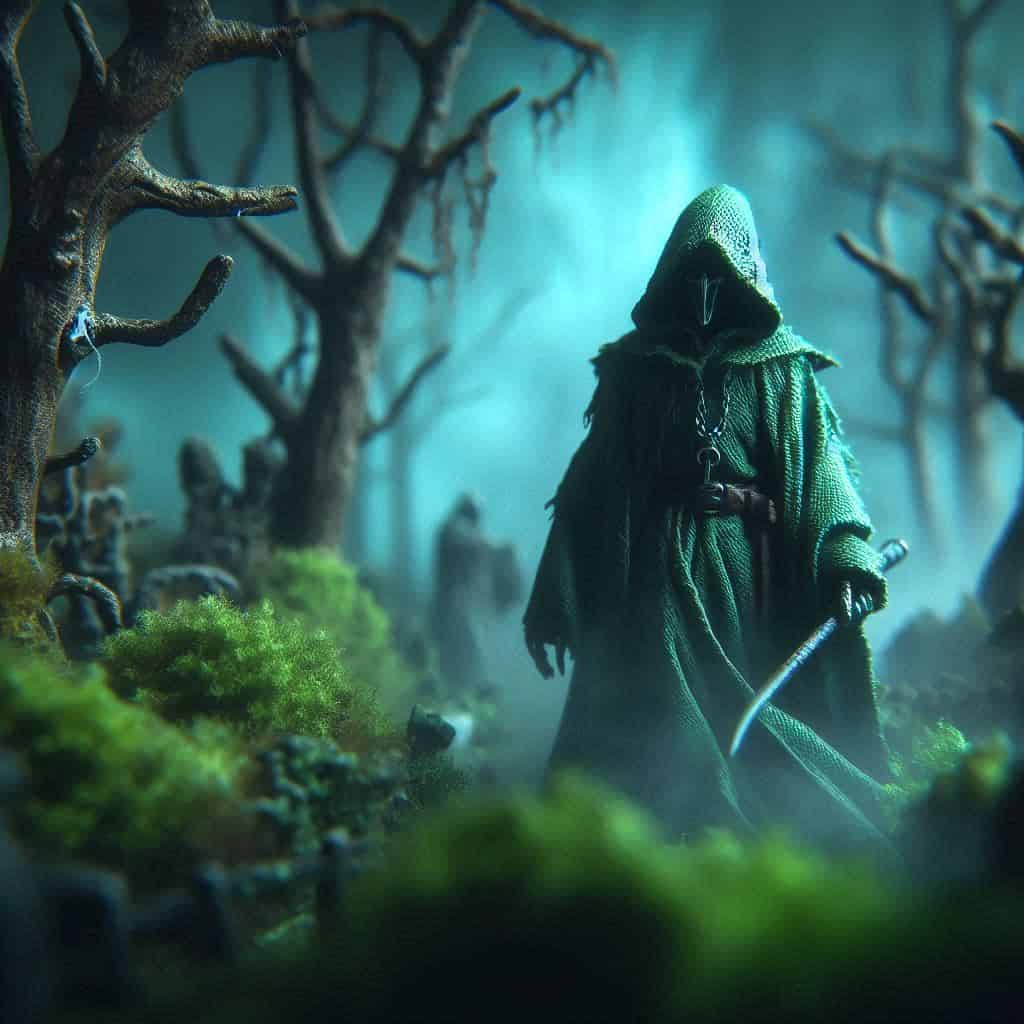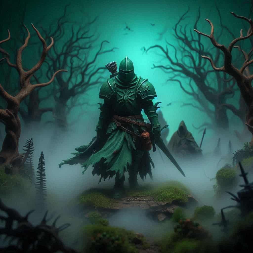 Miniature Render, The Green Knight walks through a foggy forest, Dark Fantasy, Horror Elements