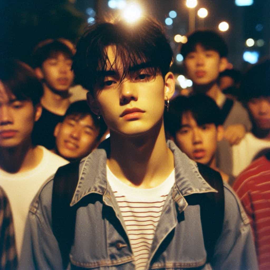 An analog candid photo of a young man lost in thought. Urban photography with 90's film grain, taken with a DSLR at f1.8. Work of a great photographer.