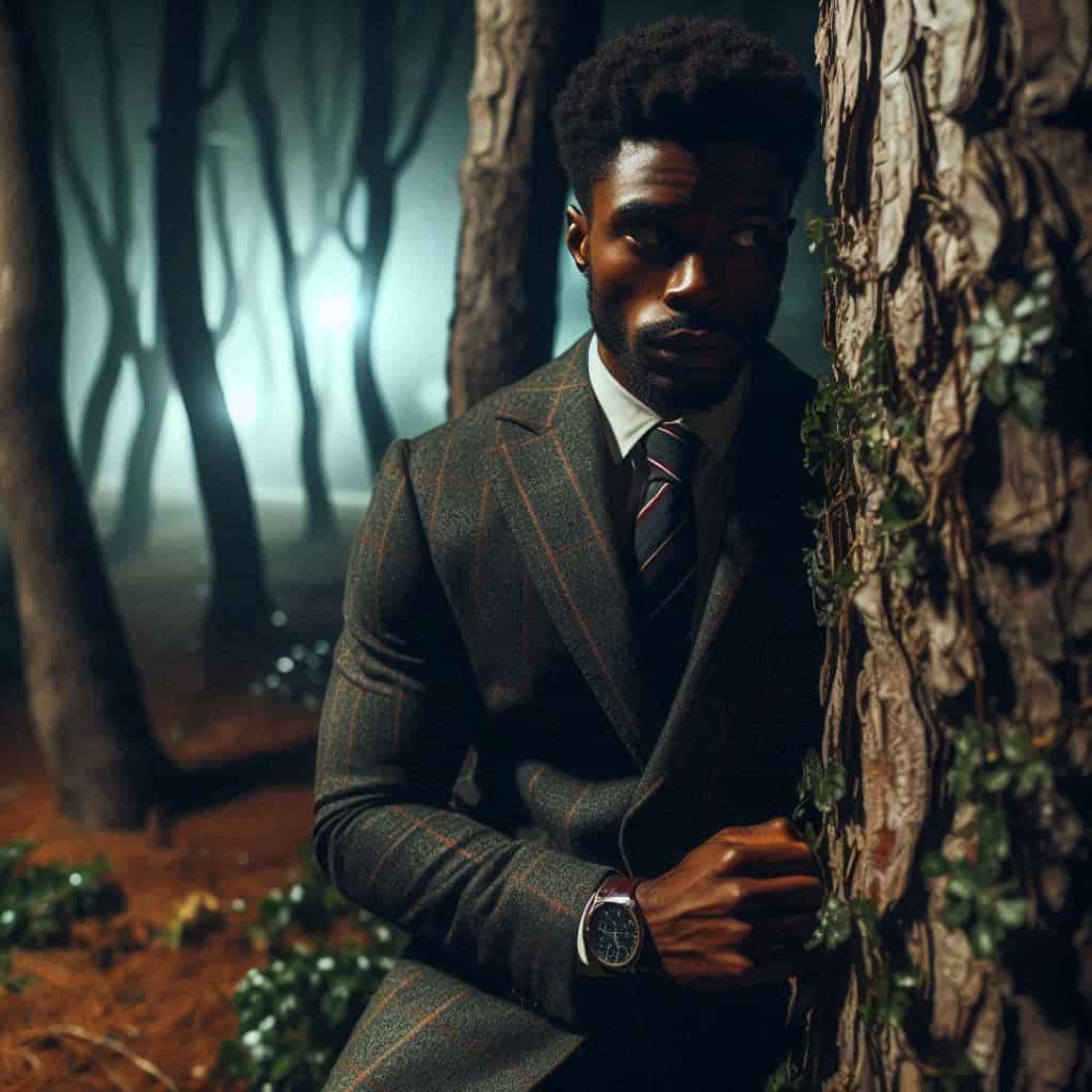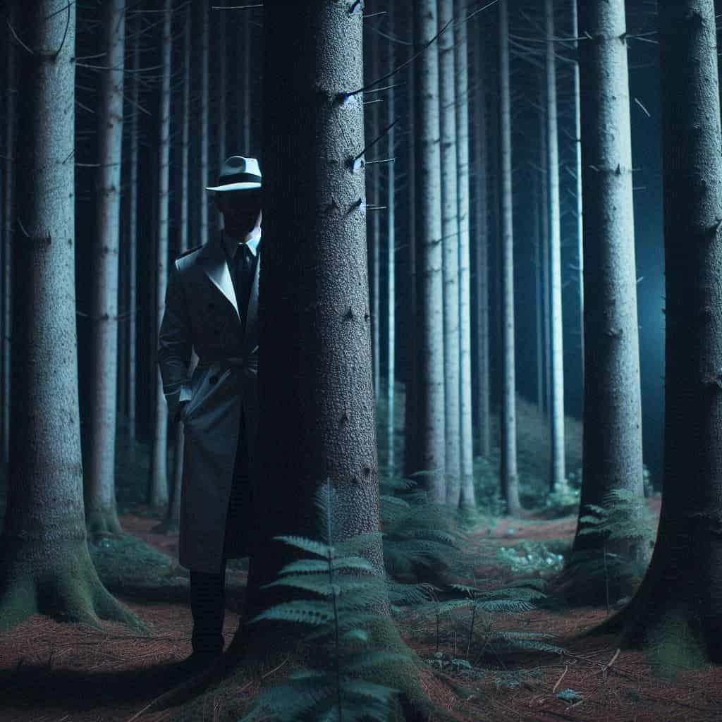 outdoor photography, woods at nighttime, found footage, a well-dressed man hiding behind trees