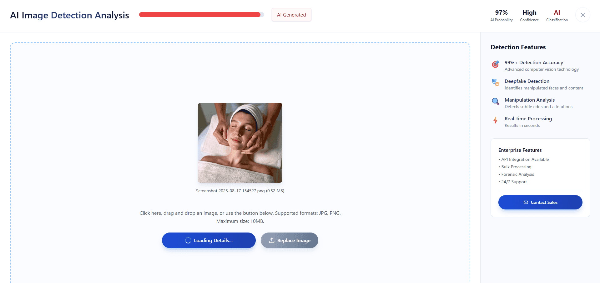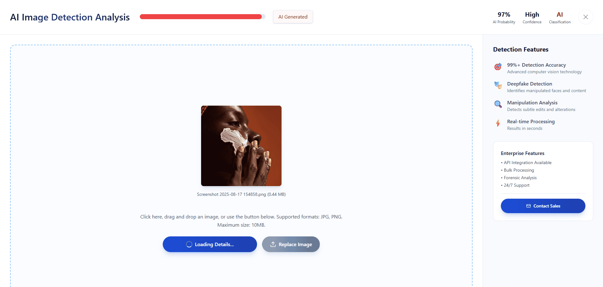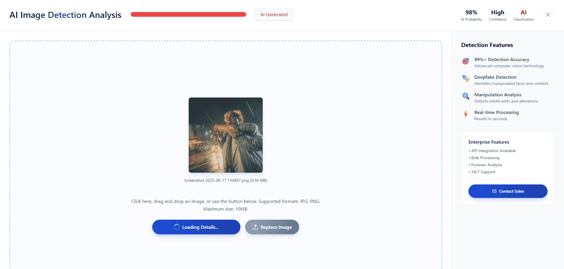 What sets it apart is how user-friendly it is. Instead of drowning you in technical jargon or requiring a forensic background, it gives a straightforward output: real or AI. Alongside that, it provides a confidence percentage, which helps you judge how much weight to give the result.