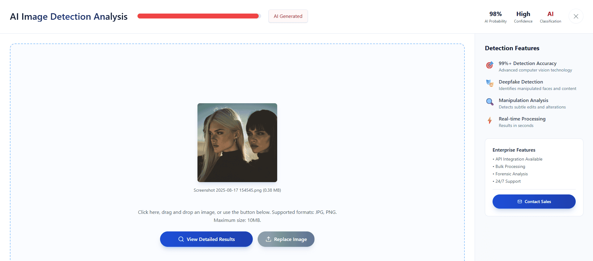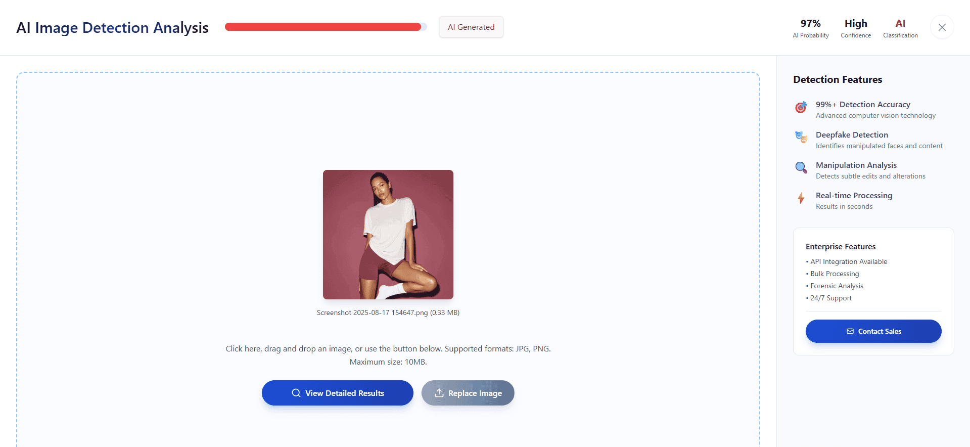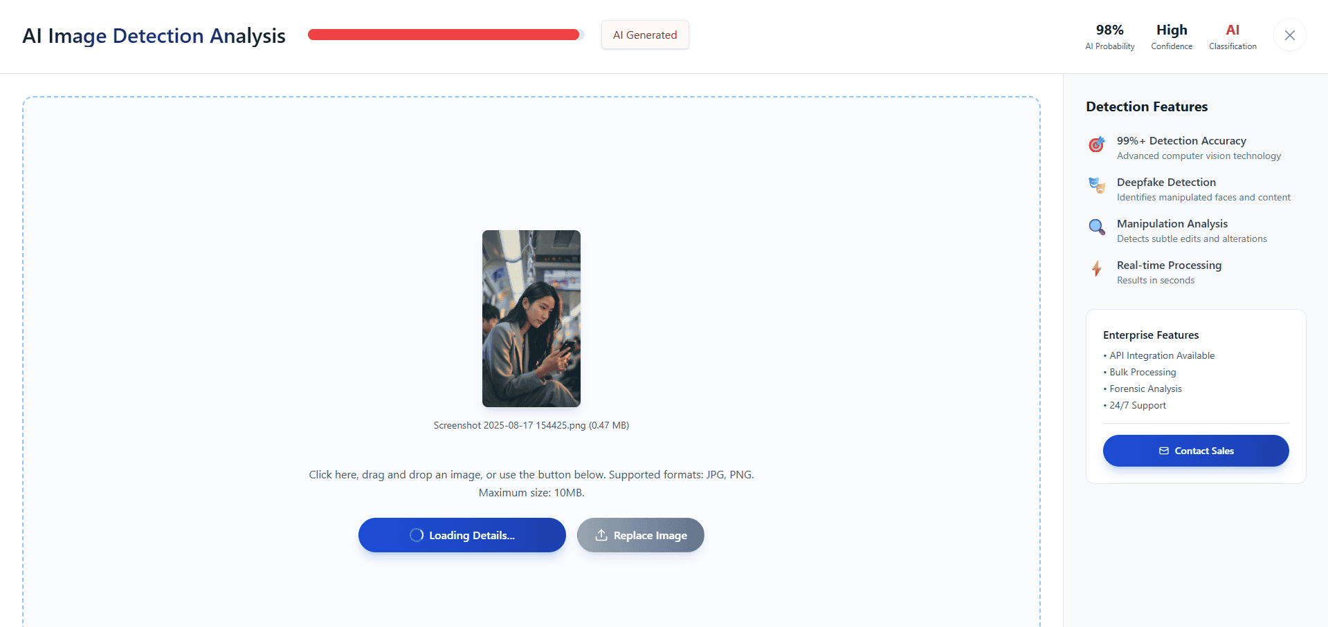 What sets it apart is how user-friendly it is. Instead of drowning you in technical jargon or requiring a forensic background, it gives a straightforward output: real or AI. Alongside that, it provides a confidence percentage, which helps you judge how much weight to give the result.