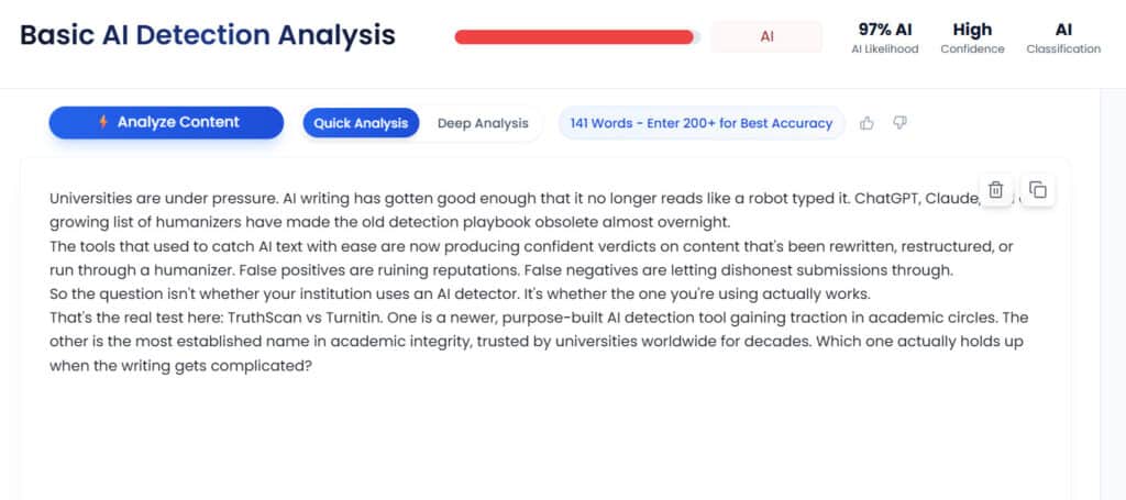 For universities that need to catch AI writing in its more sophisticated forms, TruthScan performed better in this test. But winning a six-sample comparison is not the same as winning the argument for wholesale adoption.