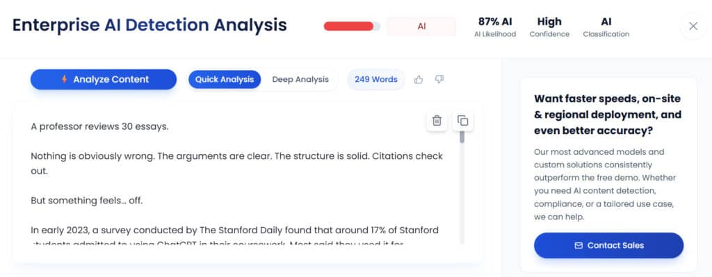 It detects outputs from major models including GPT-4, Claude, and others, and supports API integration for institutions that want to plug it directly into existing workflows. It's also SOC 2 compliant, which matters for universities handling sensitive student data.