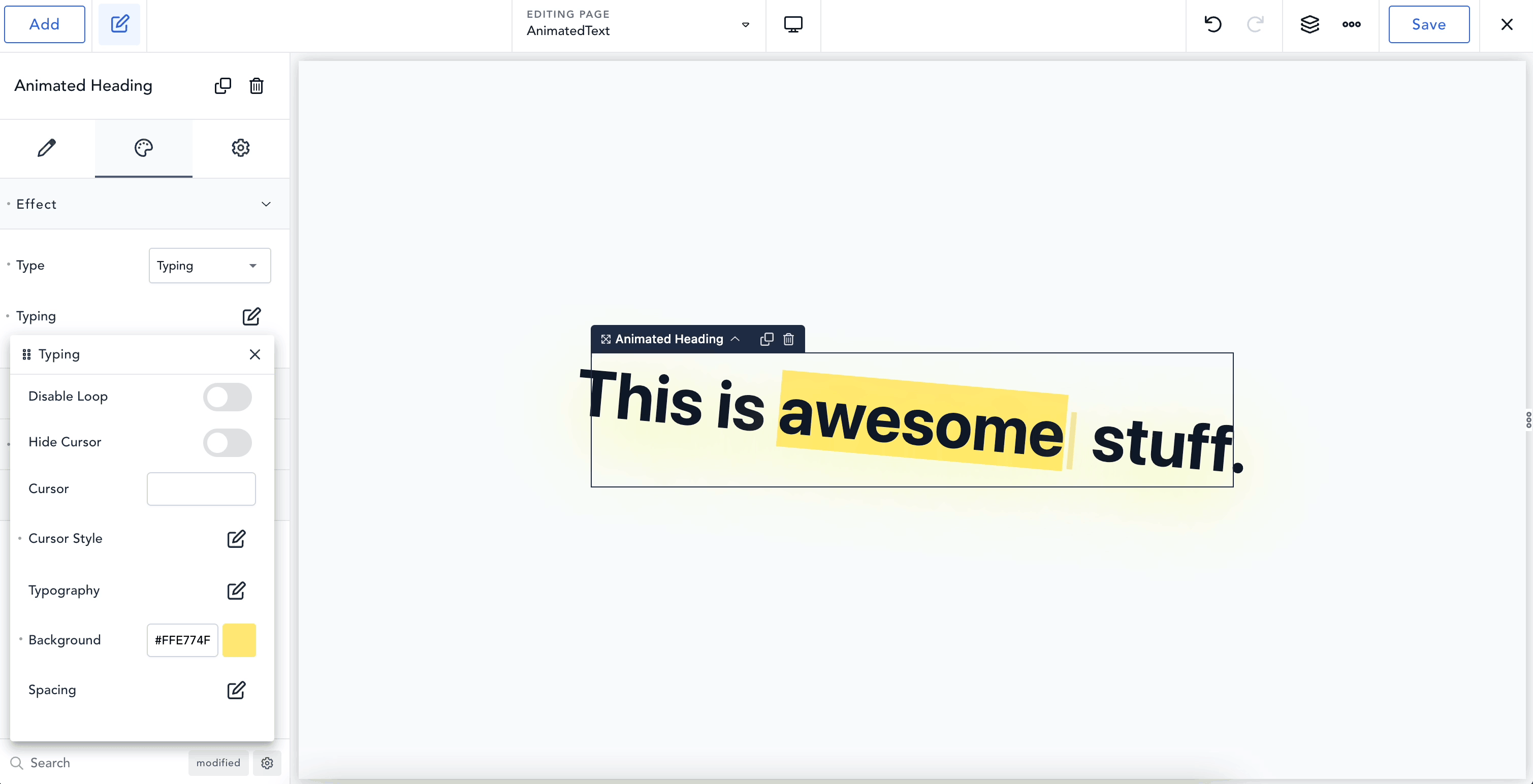 Creating the effect in Breakdance is fairly straightforward, you can add an Animated Header element, change the animation type to typing, then customize the colors and settings. We put our Animated Header in a section and customized both of them. If you want to use the exact settings we used to make the above gif, here's what we did: