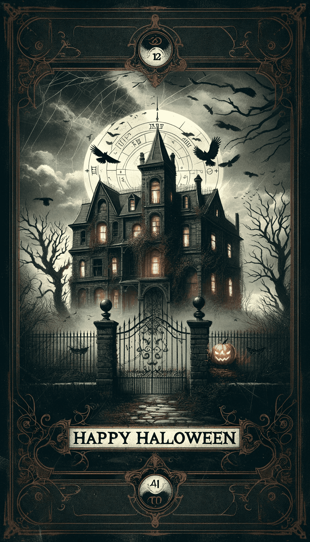 A Halloween postcard inspired by Tarot cards. It must feature an old and creepy mansion.