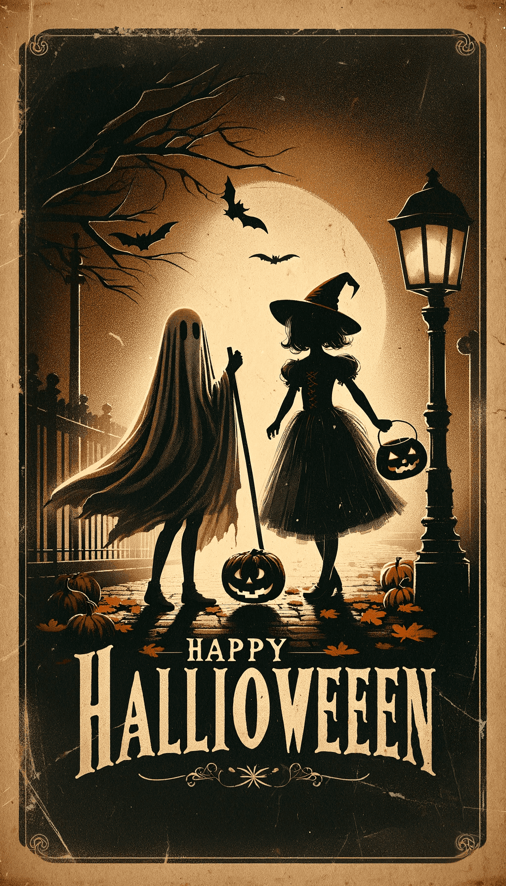 Add a silhouette of a two children in old-fashioned Halloween costumes,