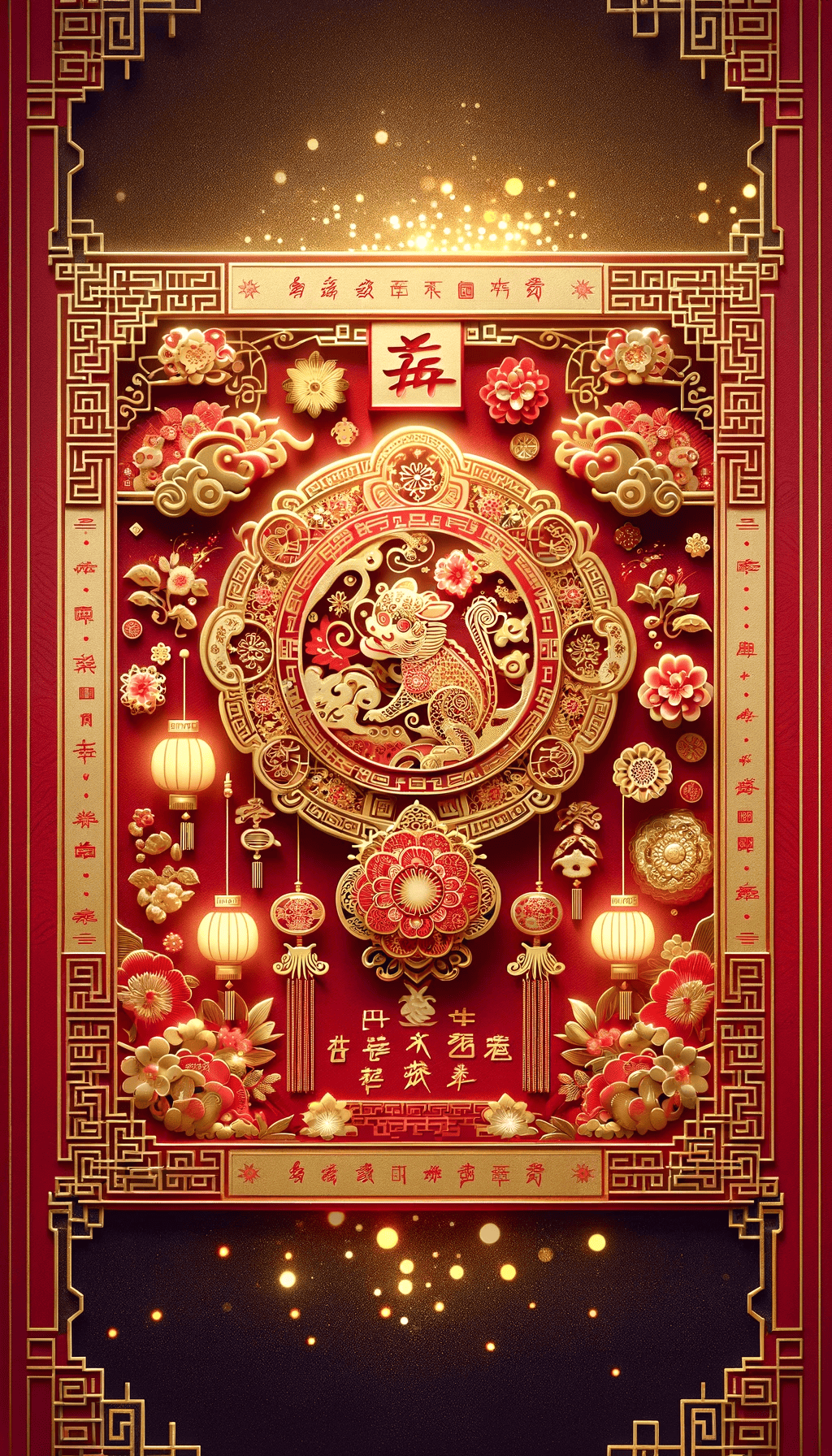 A Chinese New Year postcard design featuring a vibrant watercolor scene of a