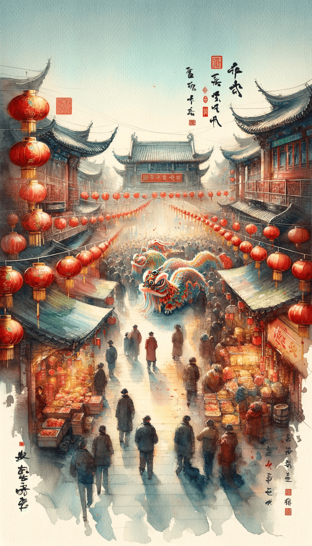bustling Lunar New Year market in Beijing with red lanterns and dragon dancers,