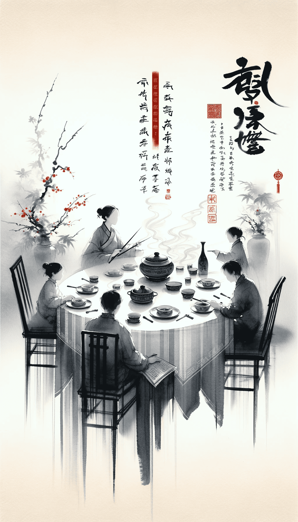 depicting a quiet family dinner for Chinese New Year, with subtle red accents.