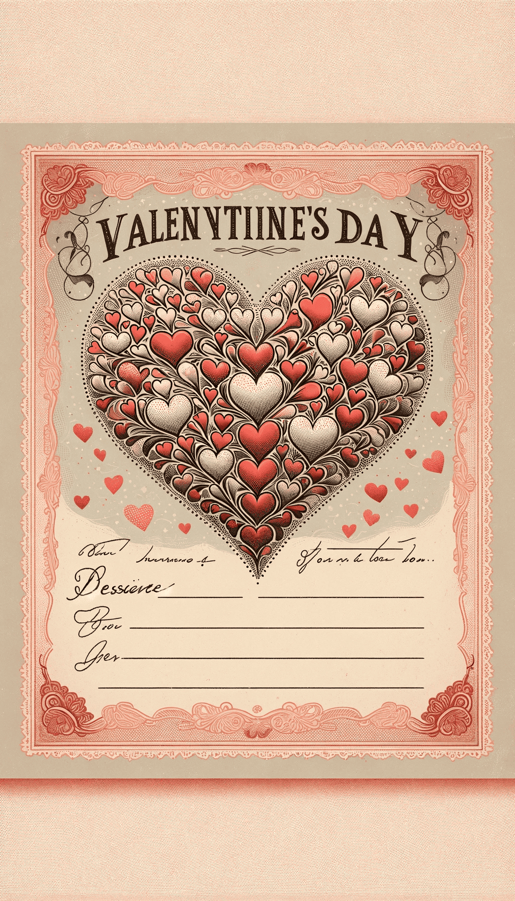 A Valentine's Day postcard design featuring a whimsical garden with heart-shaped flowers