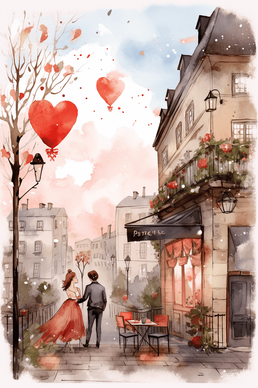 A Valentine's Day postcard design based on a watercolor illustration of a Parisian street,