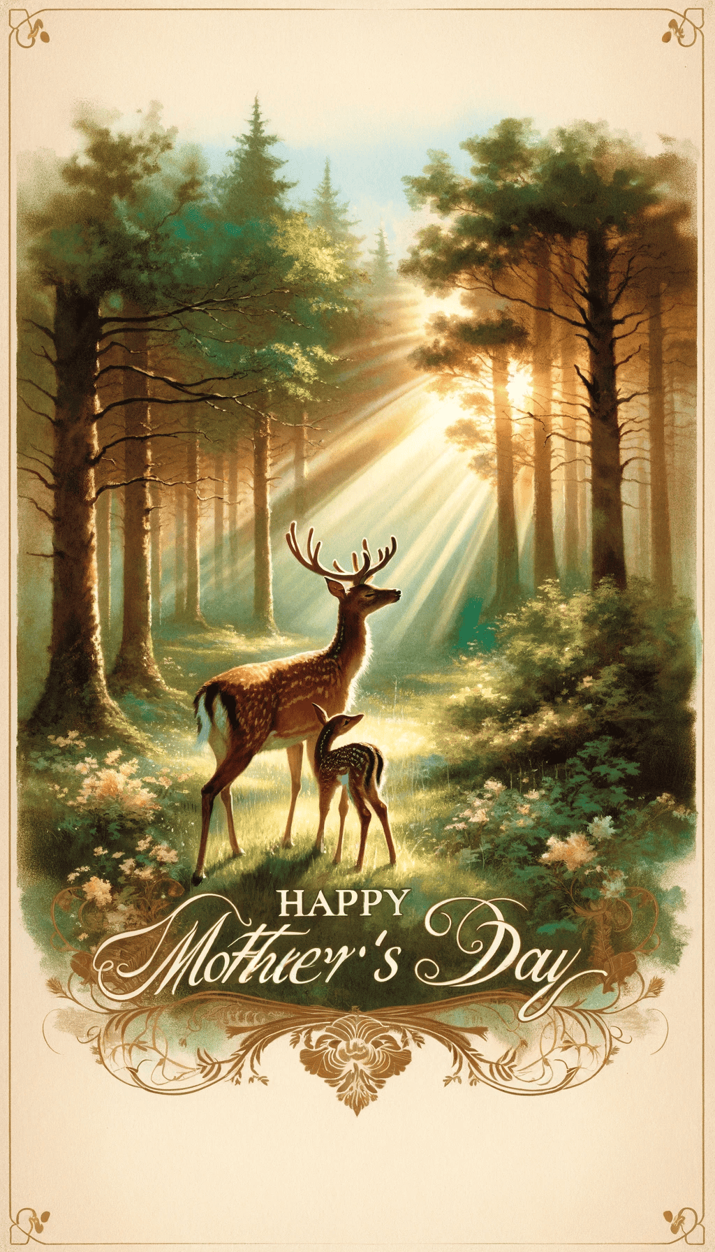 A Mother's Day postcard featuring a watercolor scene of a mother deer