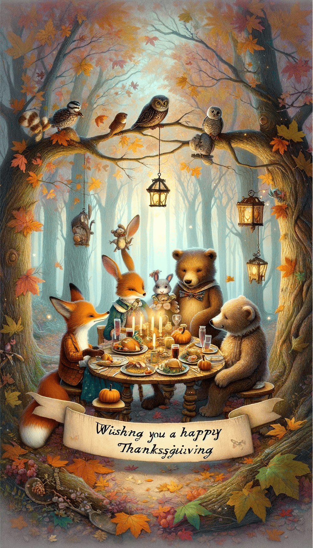 A Thanksgiving holiday postcard featuring whimsical woodland creatures sharing a Thanksgiving feast, in a storybook illustration.