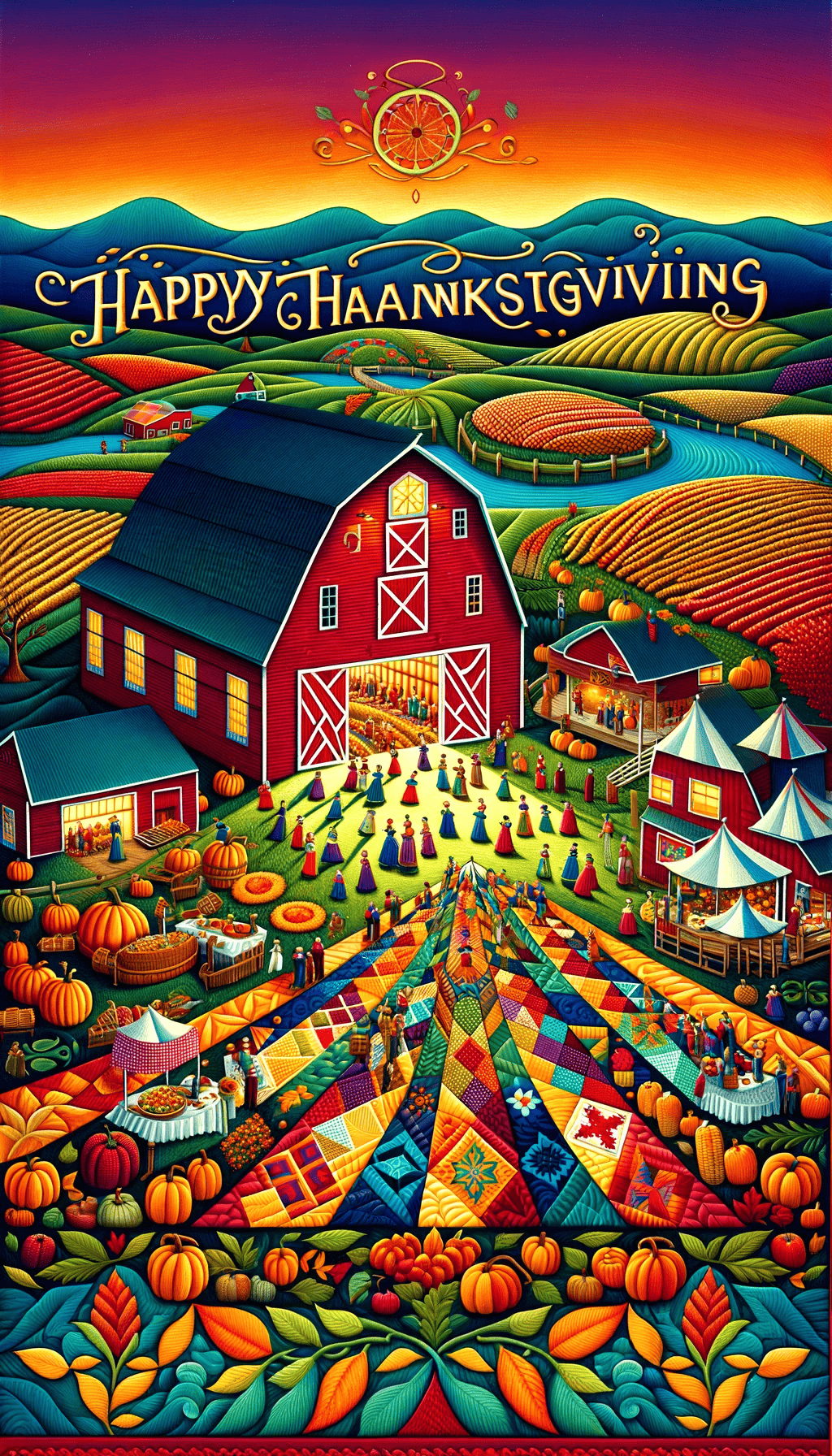 A Thanksgiving postcard design featuring harvest festival at a barn, with quilt patterns adorning the landscape, in a folk art style.