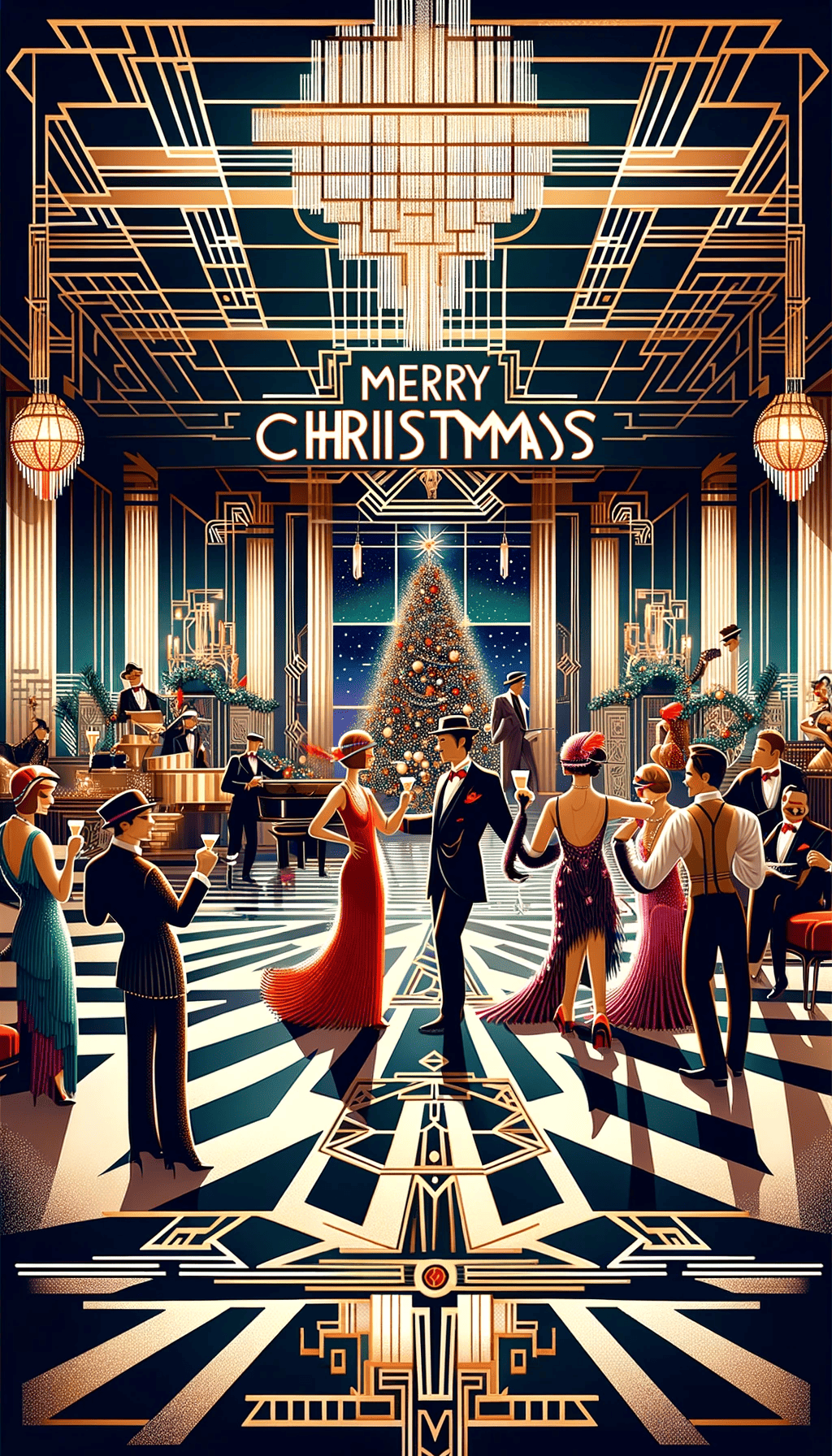 An art deco-style postcard featuring a glamorous Christmas Eve party set