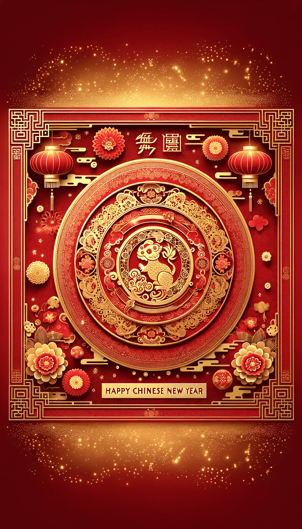 A Chinese New Year postcard design featuring a vibrant watercolor scene of a