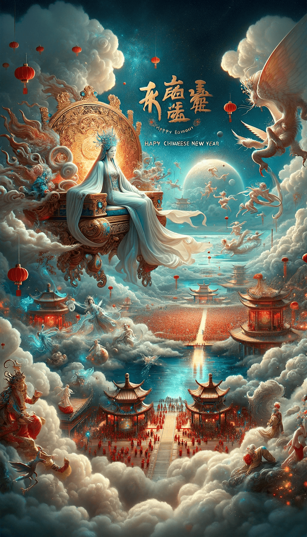 the Jade Emperor observes Chinese New Year celebrations from the clouds,